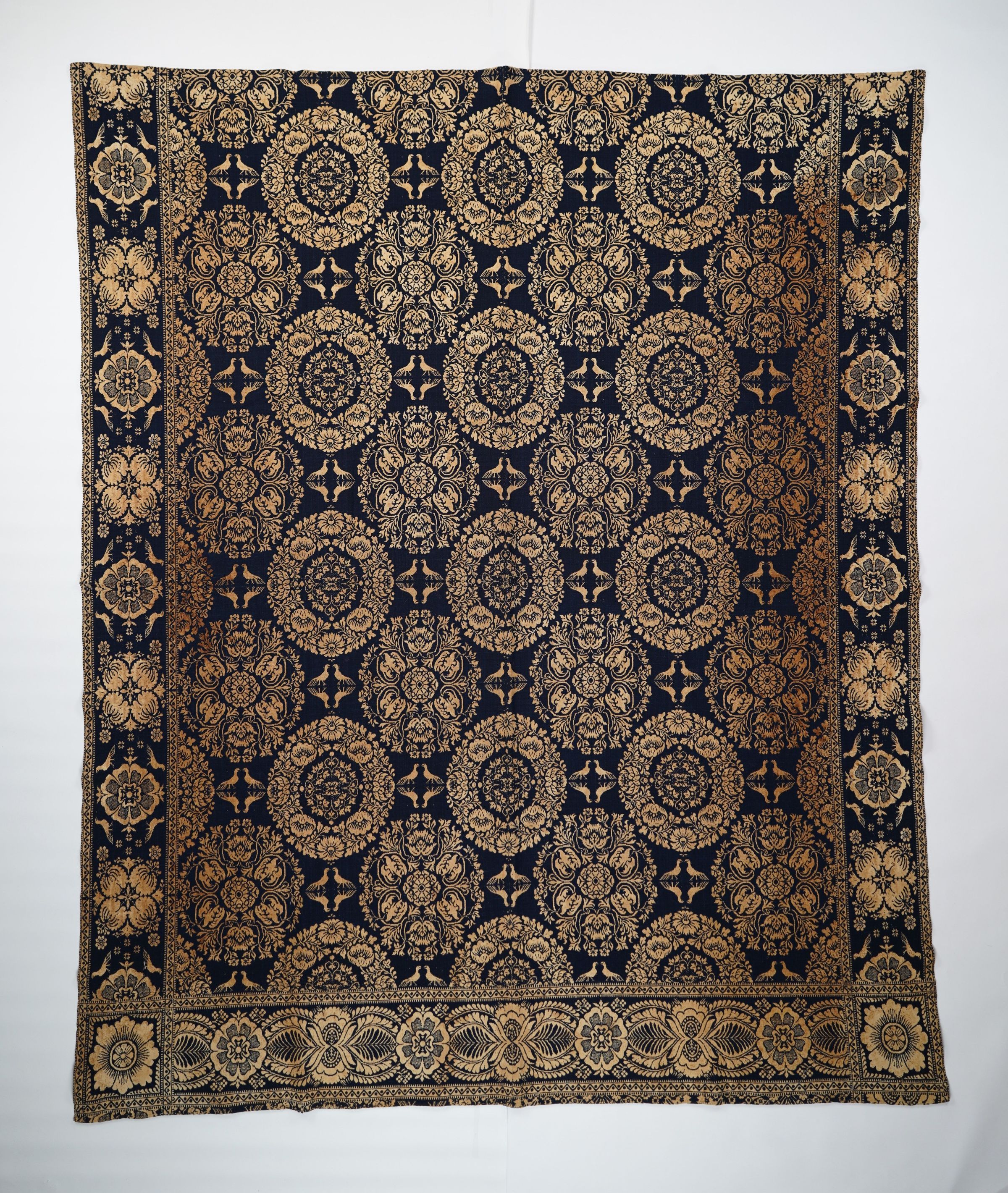 Navy and natural figured double weave coverlet with border on three sides. Two joined panels.