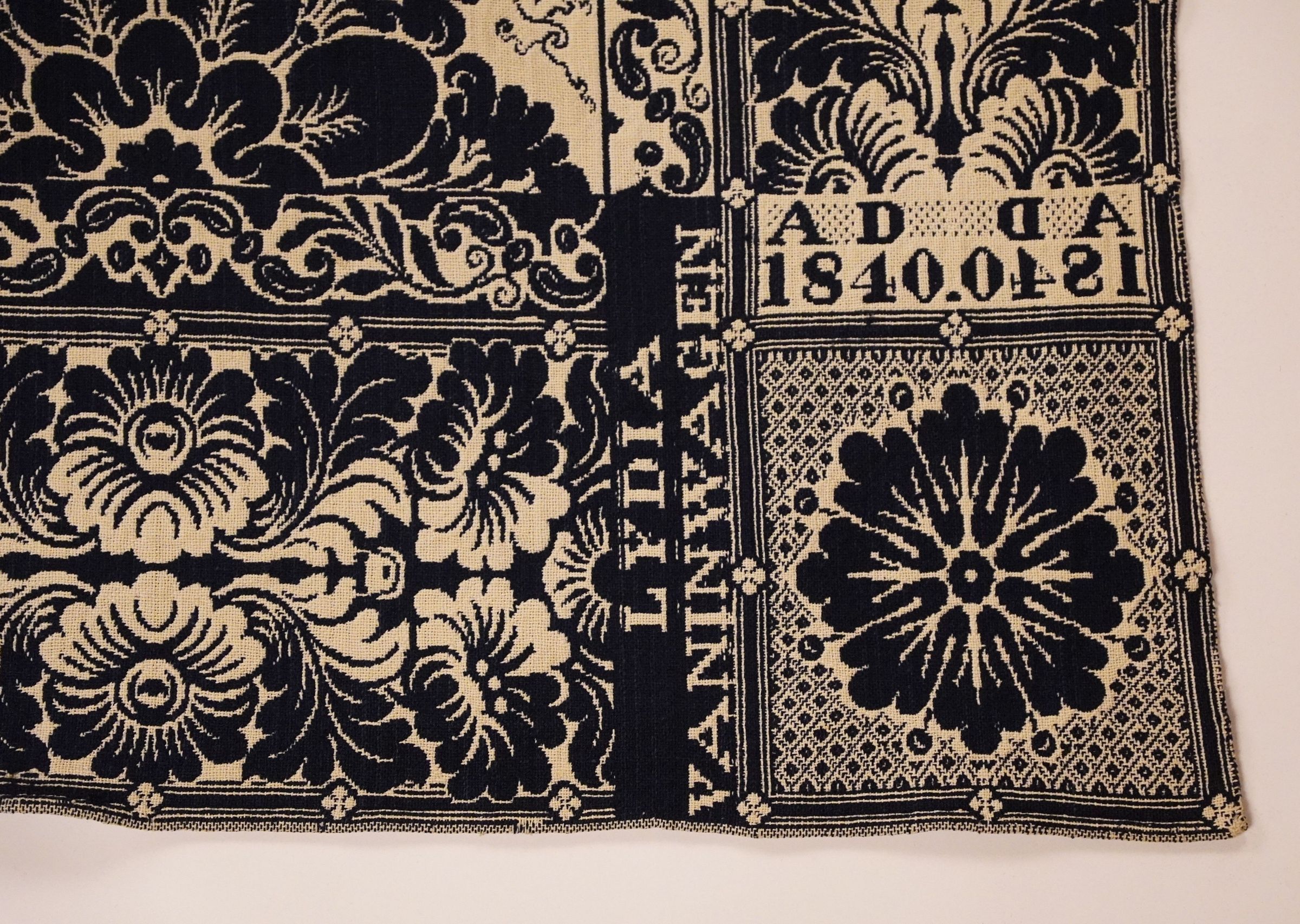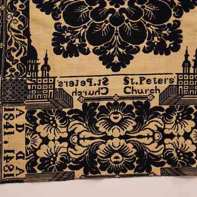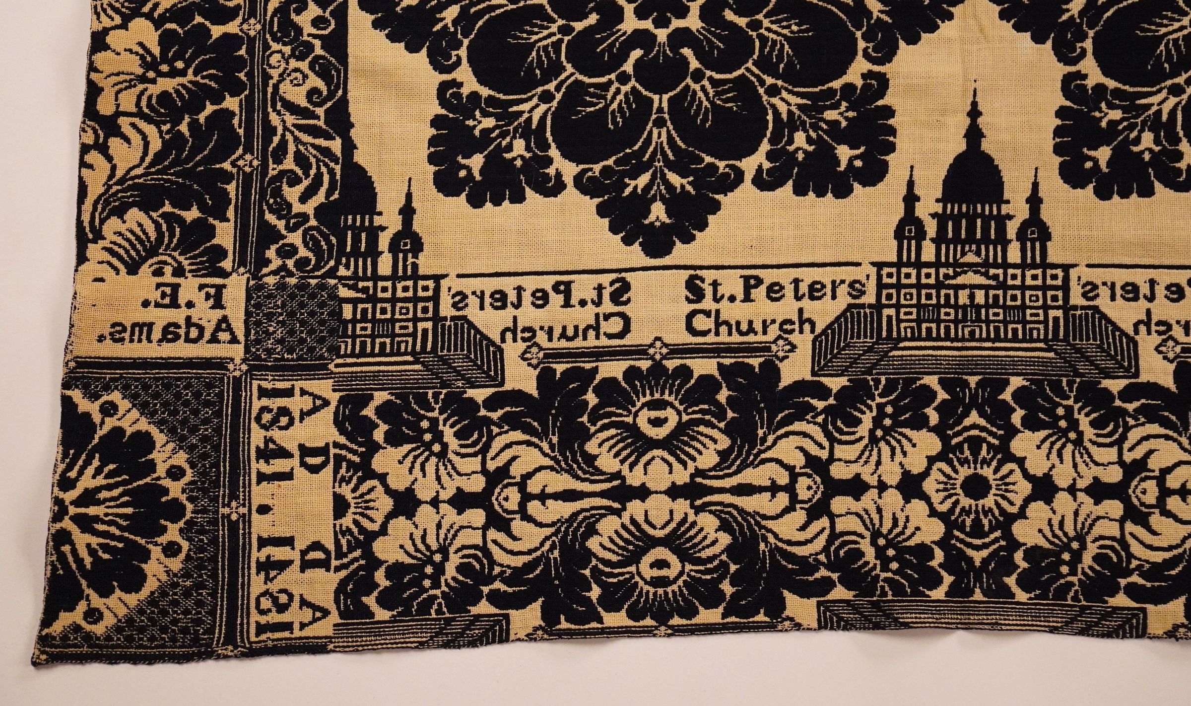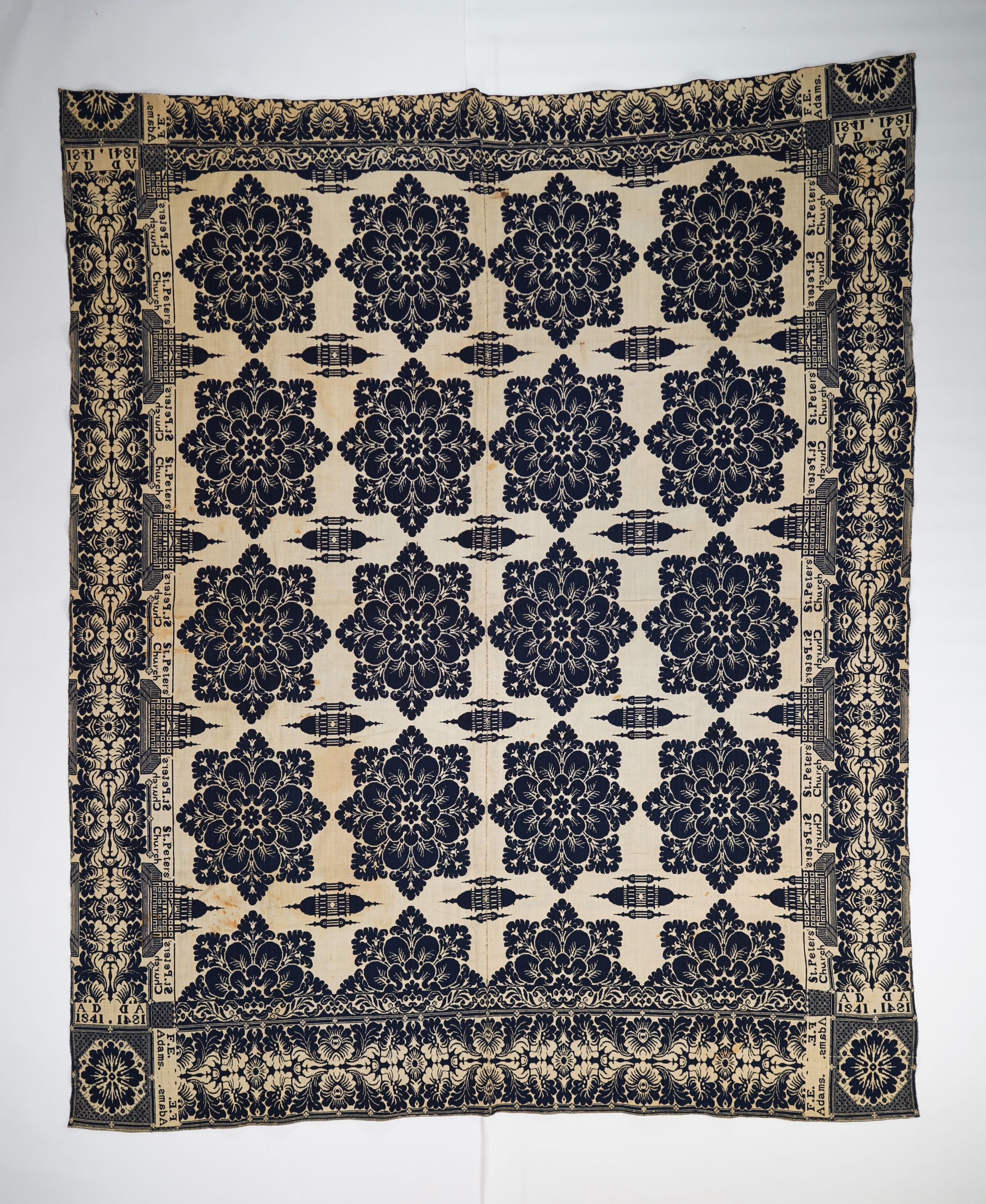 Navy and natural figured doublecloth coverlet with border on four sides. Two joined panels. Woven for F. E. Adams by A. D. in 1841. Border depicts St. Peter's Church in Vatican City.Collection