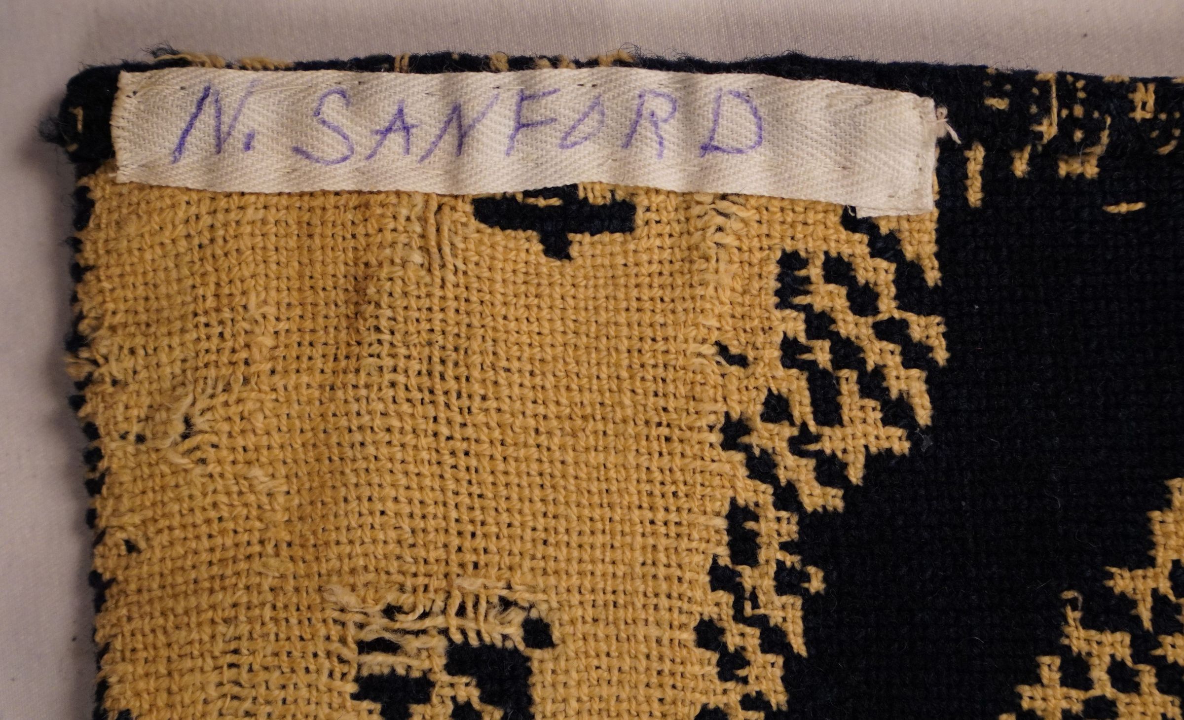 Navy and natural figured double weave coverlet; two panels joined by a center seam. No fringe. Border on three sides.Collection