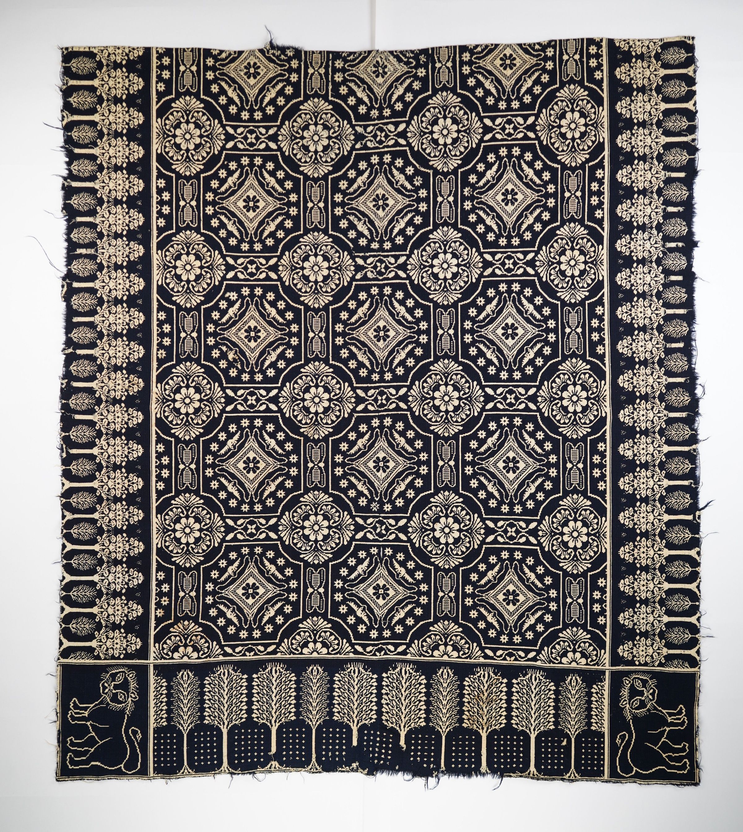 Figured and fancy doubleweave coverlet with borders on 3 sides and no fringe. Two panels joined by a center seam. Navy wool with undyed cotton. Fancy floral tile medallions pattern in centerfield with small birds. Tree border on sides; larger tree border on bottom. Woven with big lion ("hollow lion") trademark in cornerblock.Context