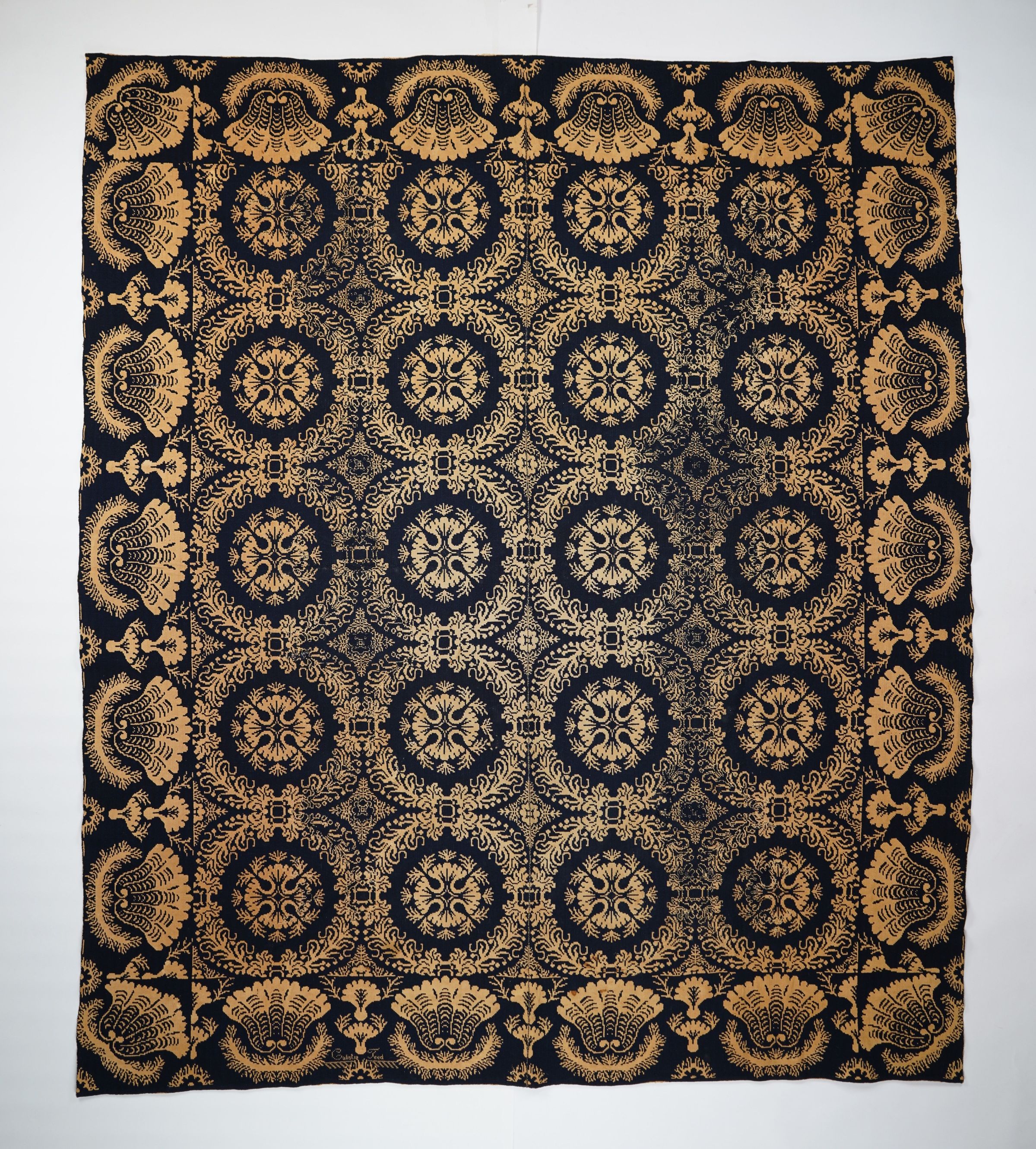 Navy and natural figured double weave coverlet with border on four sides. Two joined panels. Woven for Calistia Teed.Collection
