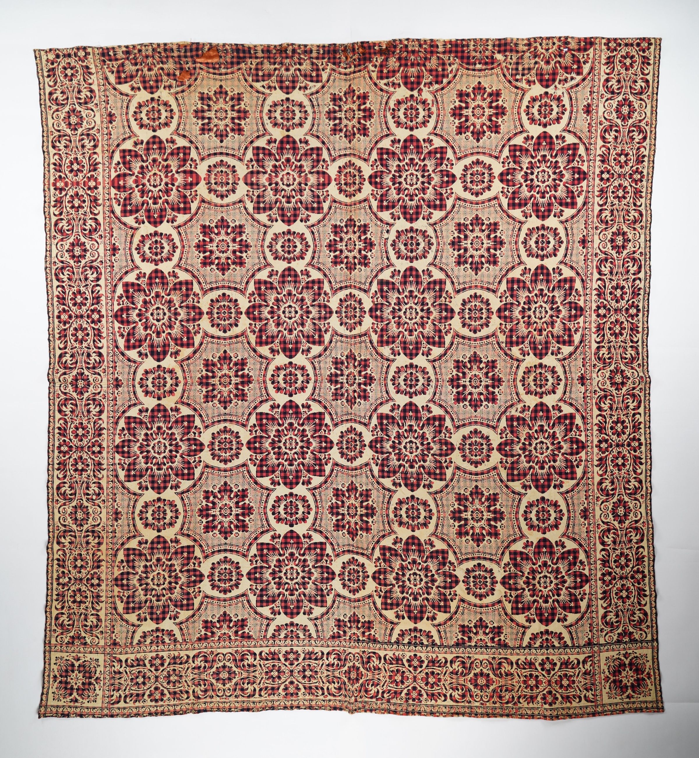 Figured and fancy doubleweave coverlet with borders on three sides and no fringe. Two panels joined by a center seam. Blue and red wool forming a plaid check layer with second layer of undyed cotton. Floral centerfield medallions; abstract border on sides and bottom. So-called "four onions" cornerblock logo.Context