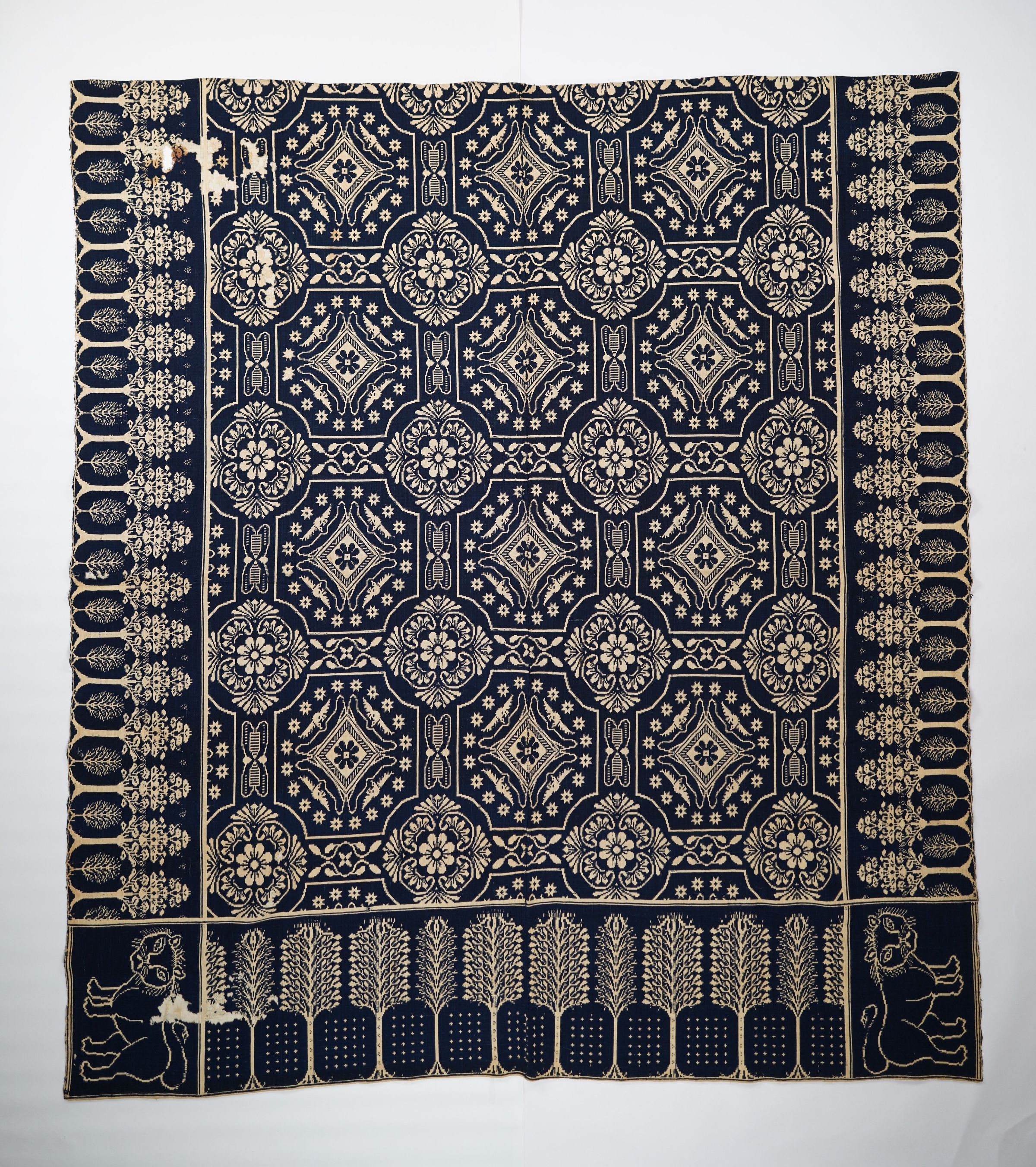 Navy and natural figured doublecloth coverlet with border on three sides. Two joined panels. Attributed to Benjamin June (Sr.) based on the lion cornerblock.Collection