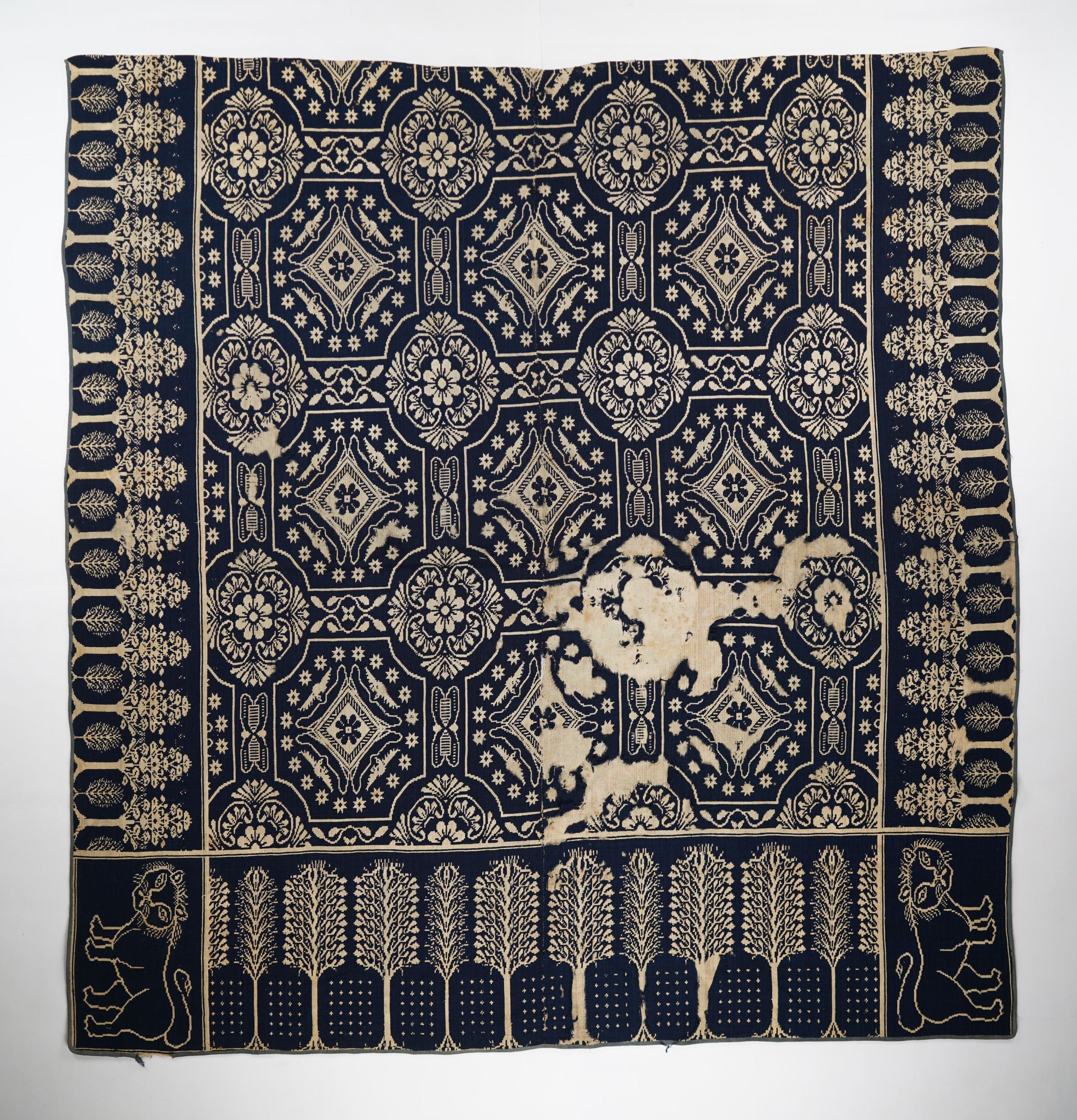 Figured and fancy doubleweave coverlet with borders on 3 sides and no fringe. Two panels joined by a center seam. Navy wool with undyed cotton. Medallion centerfield pattern; tree border on sides and bottom. Unknown weaver with large lion trademark.Context