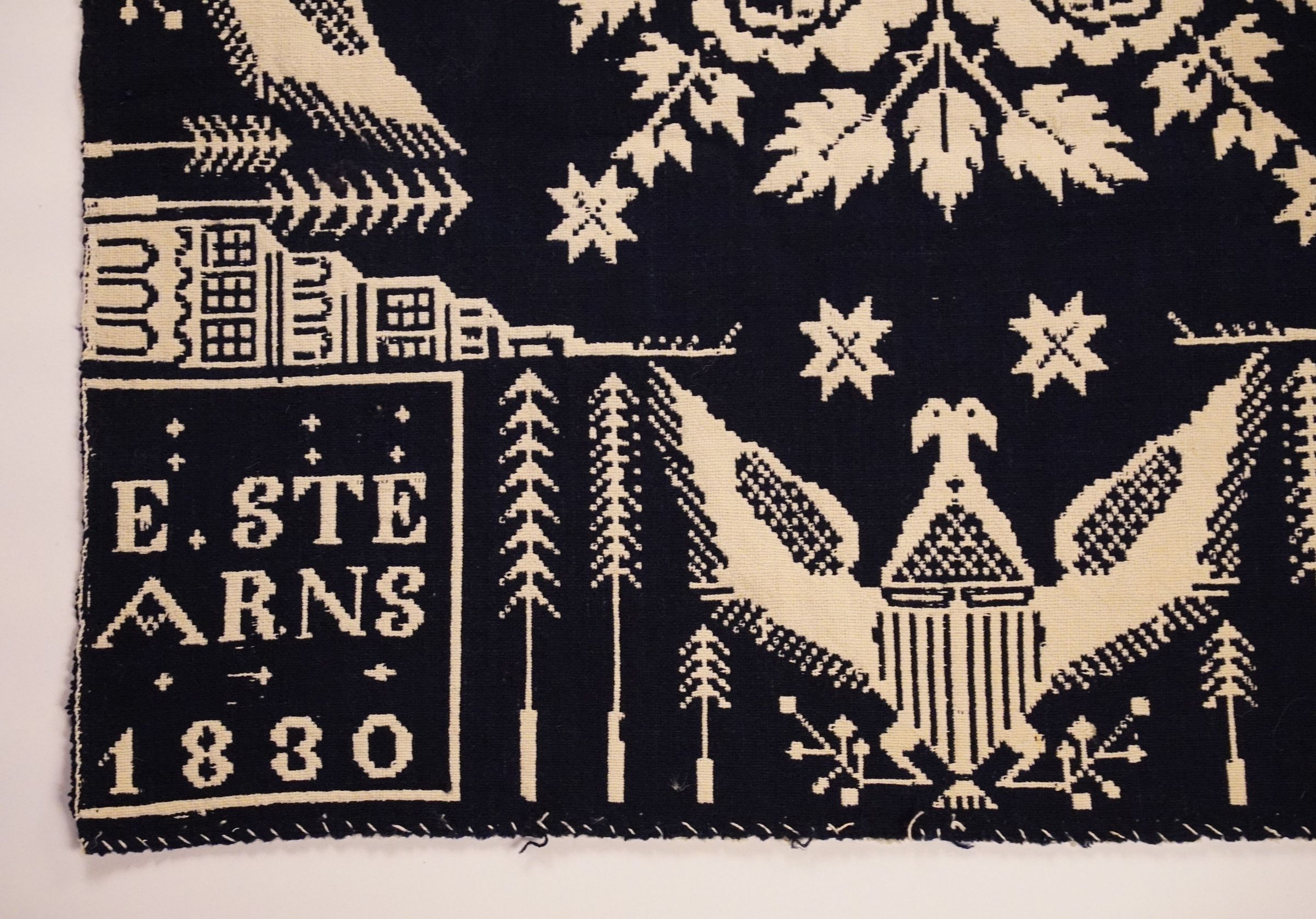 Navy and natural figured double weave coverlet with double-headed federal eagle border on three sides. Two joined panels. Woven for E. Stearns in 1830Collection