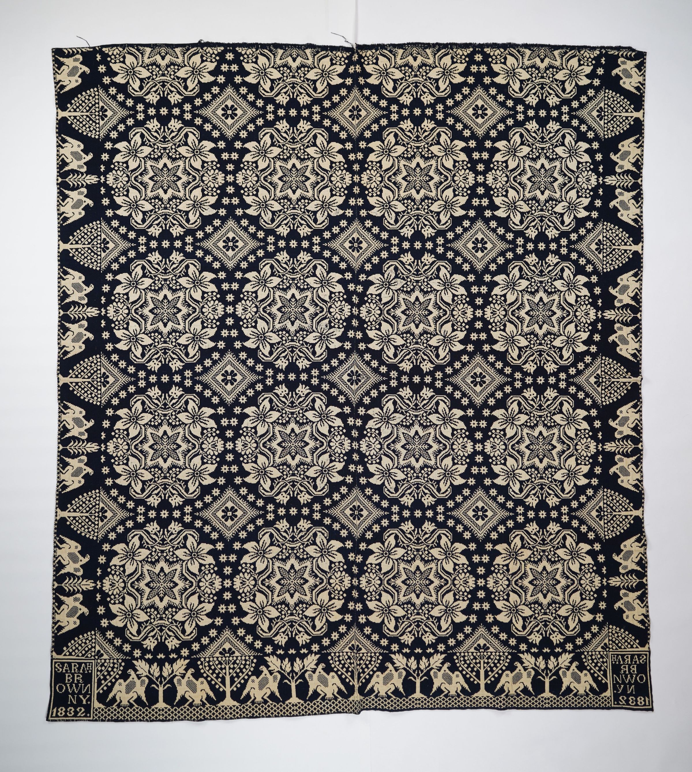 Navy and natural figured double weave coverlet with eagle and tree border on three sides. Two joined panels. Woven for Sarah Brown in New York in 1832.Collection