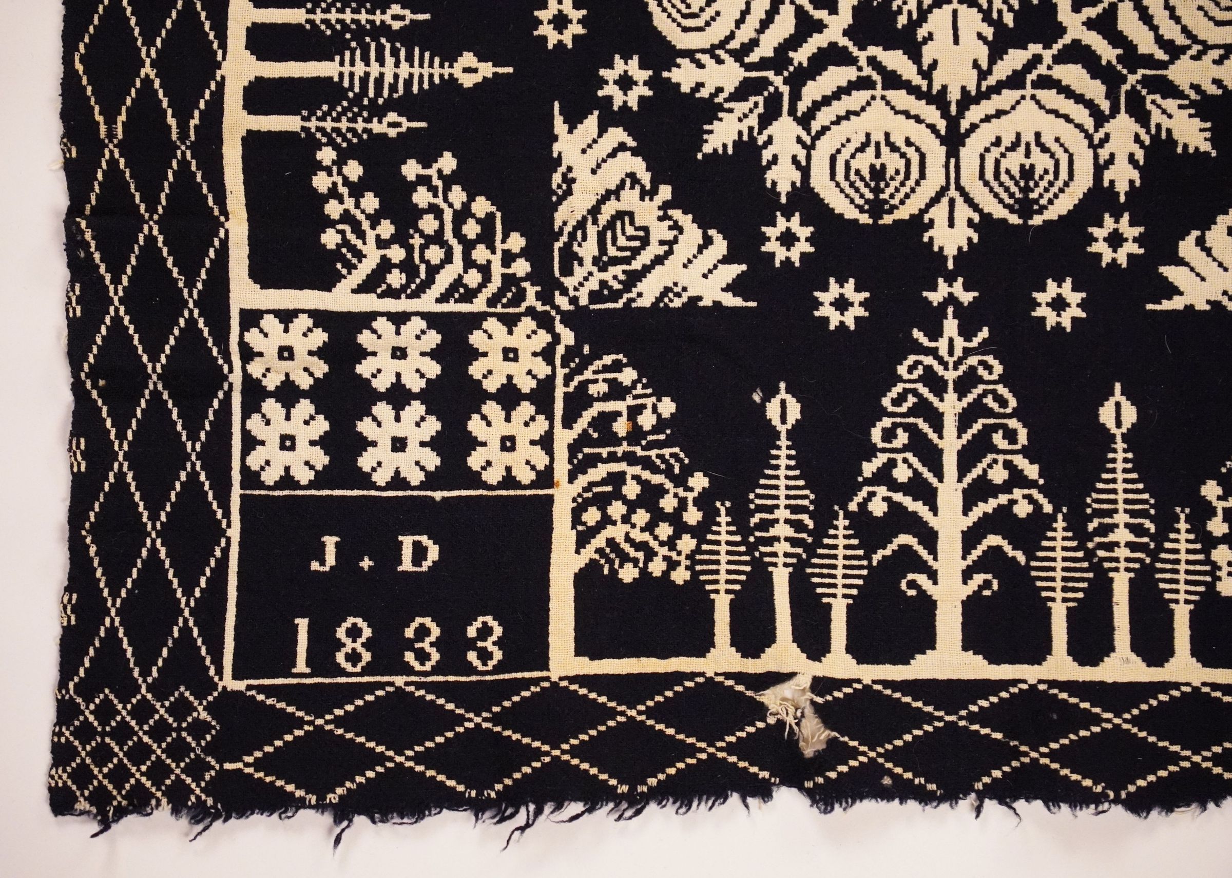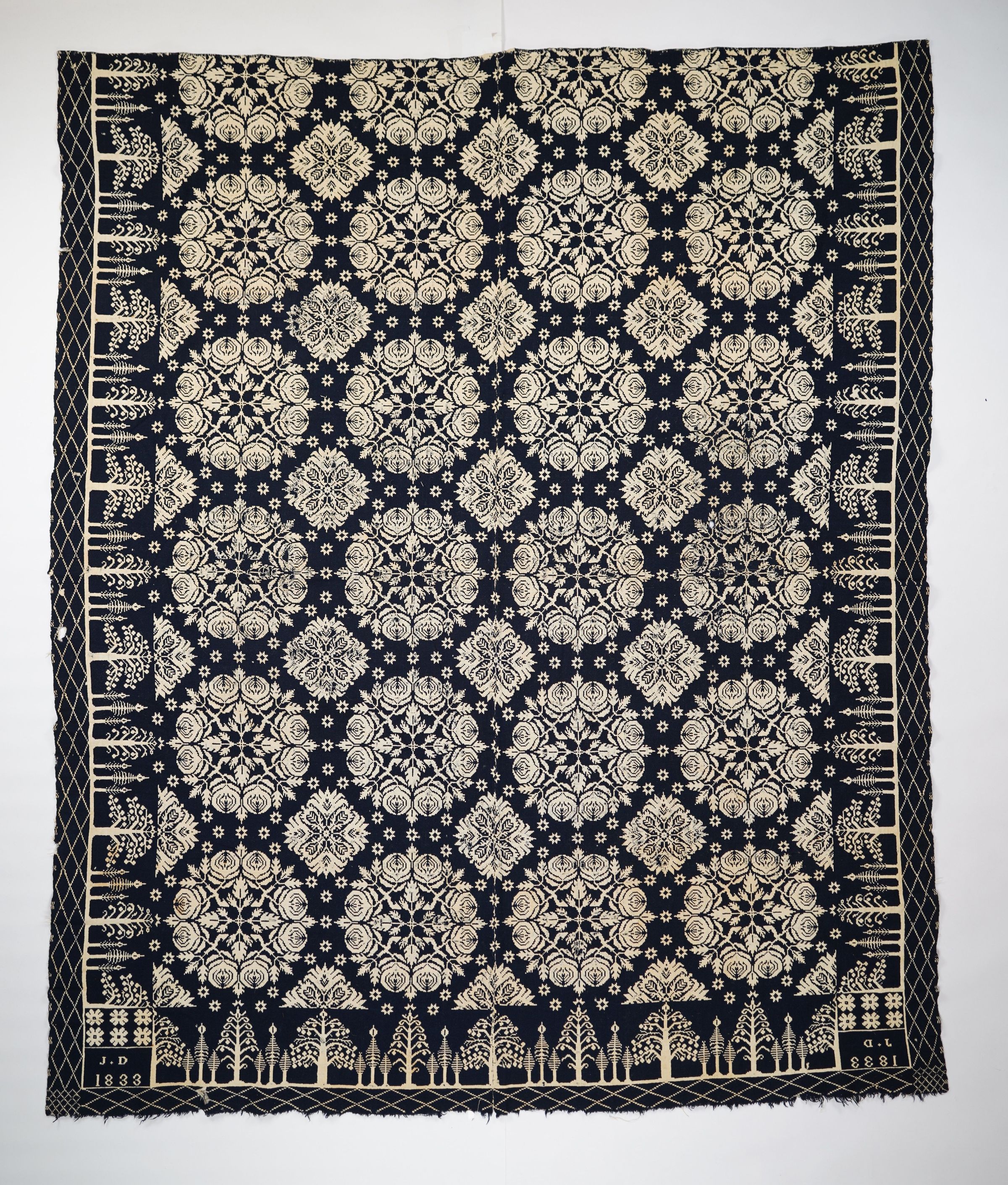 Navy and natural figured double weave coverlet with trees border on three sides. Two joined panels. Woven for J. D. in 1833.Collection