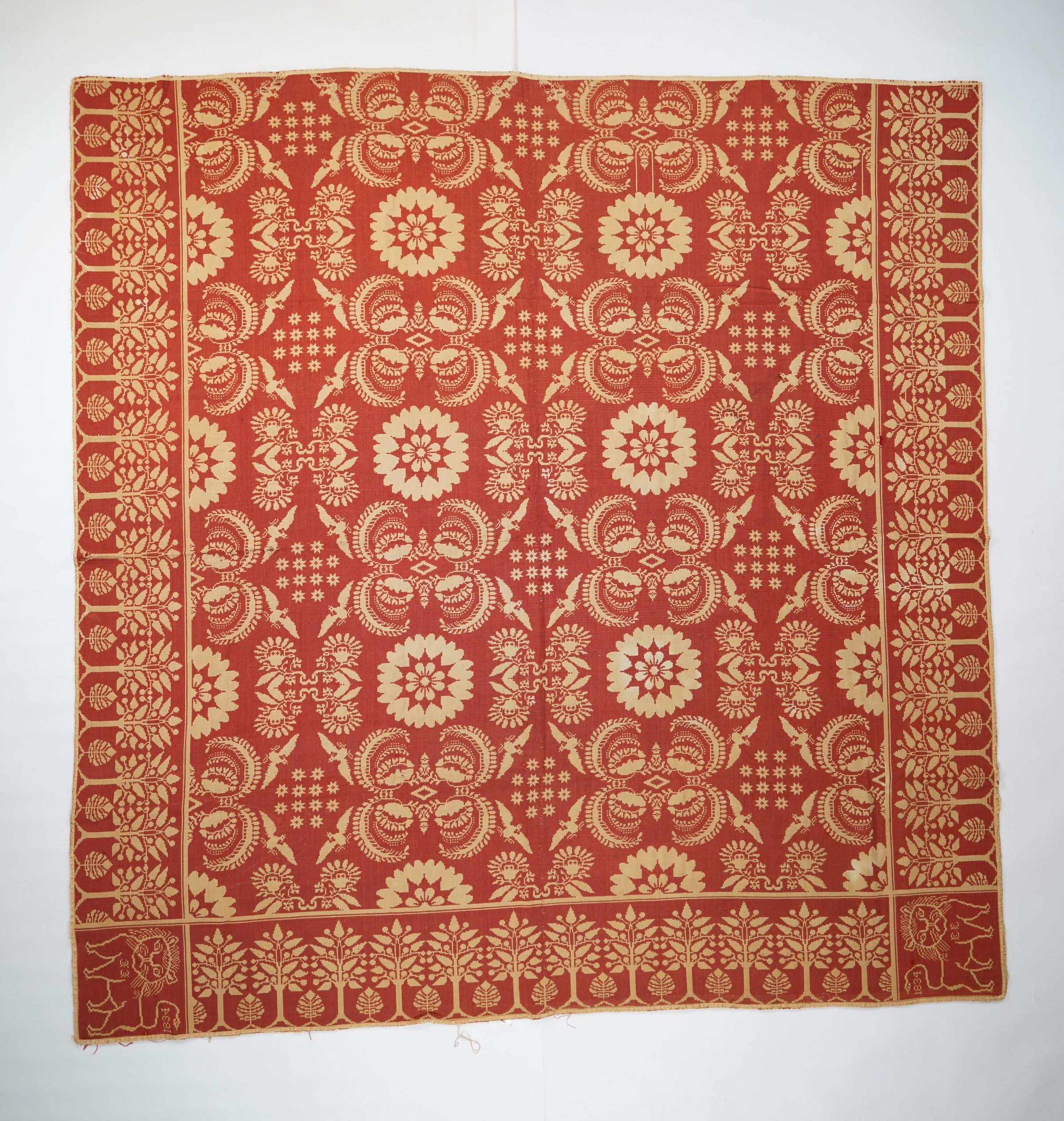 Red and natural figured double weave coverlet with tree border on three sides. Two joined panels. Woven for client with initials E. E. in 1834. Attributed to Harry Tyler.Collection