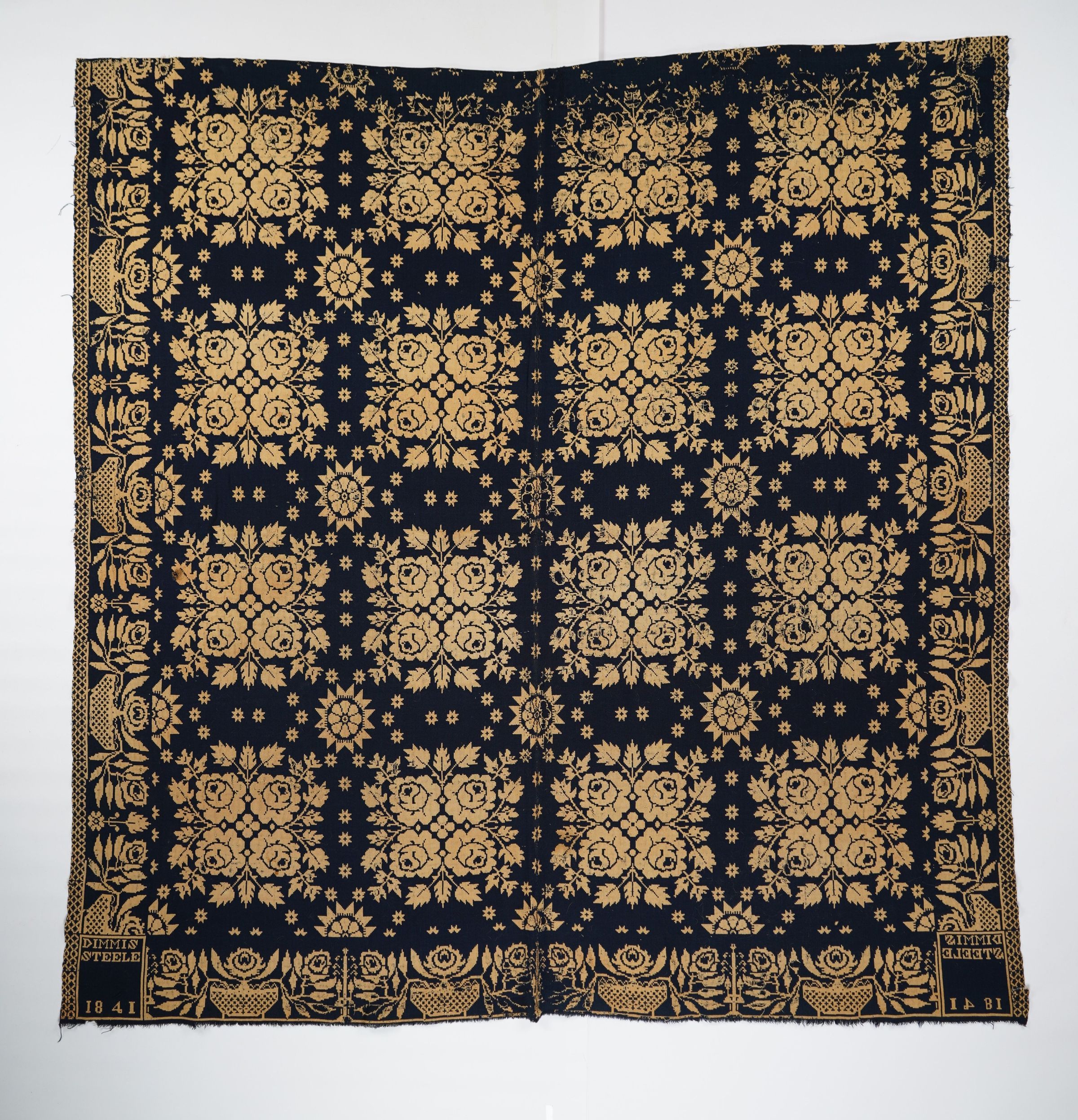 Navy and natural figured double weave coverlet with roses border on three sides. Two joined panels. Woven for Dimmis Steele in 1841Collection