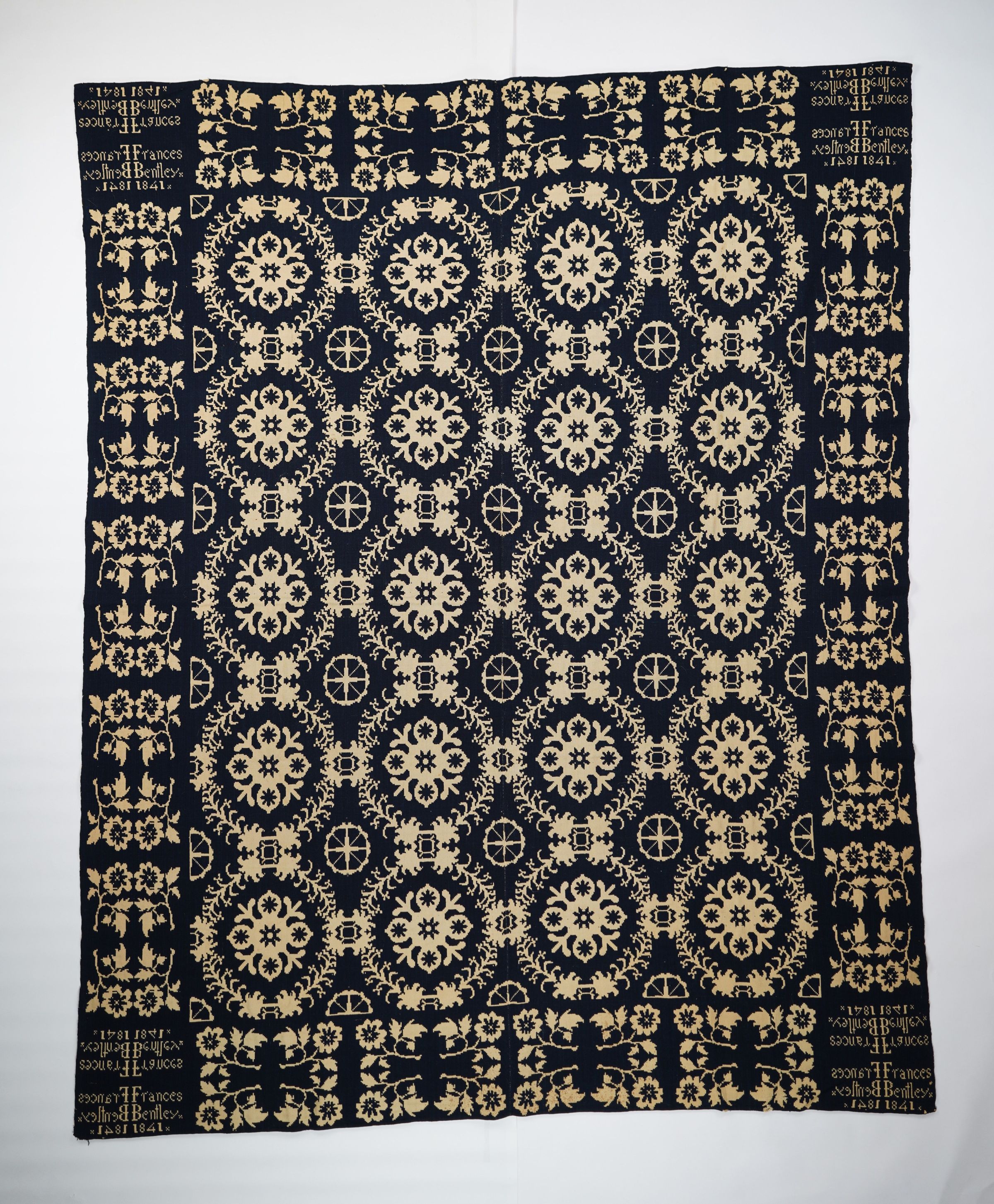 Navy and natural figured doublecloth coverlet with border on four sides. Two joined panels. Woven for Frances Bentley in 1841.Collection