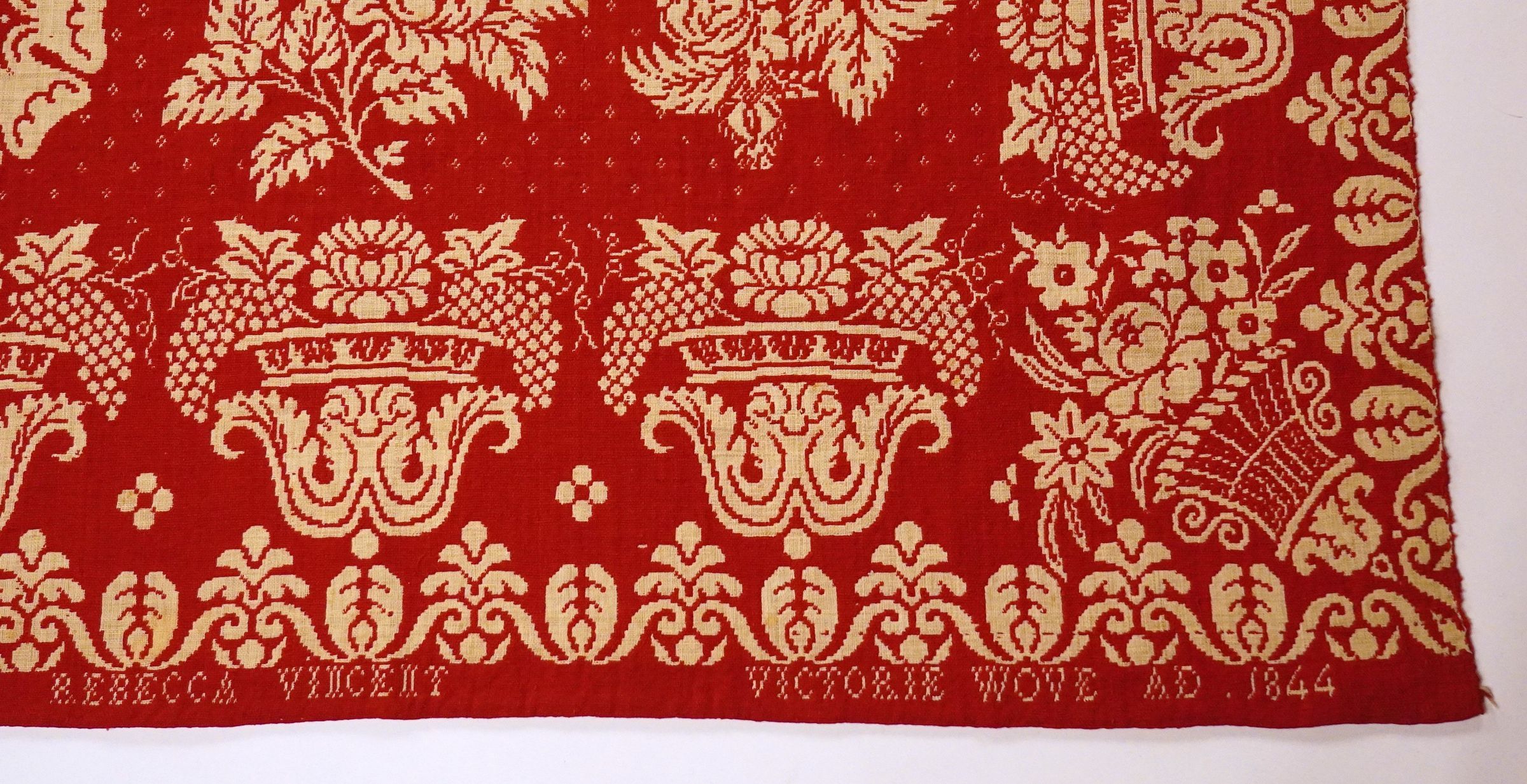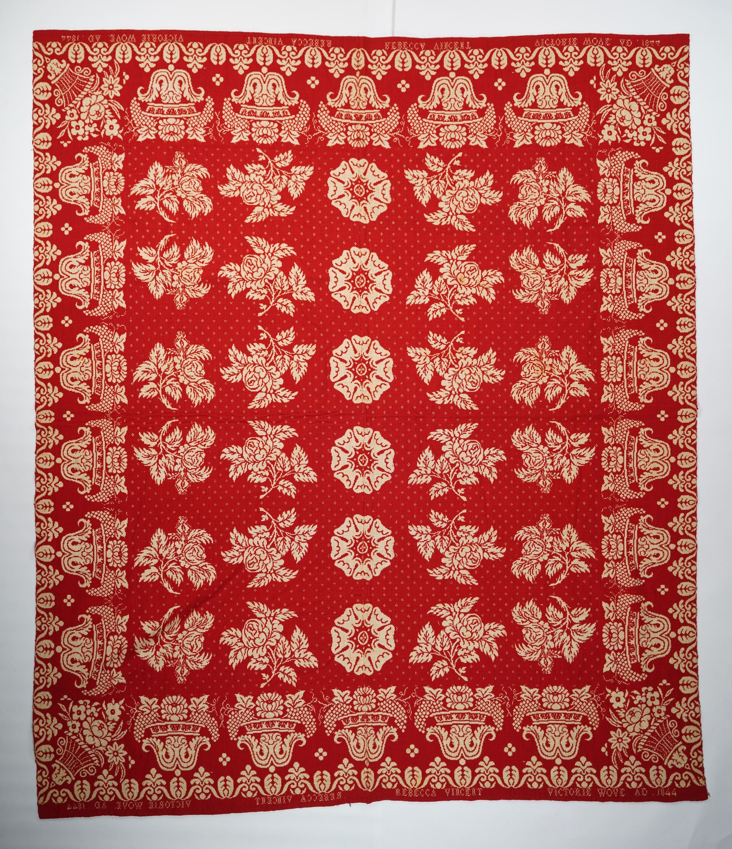 Red and natural figured double weave coverlet with border on four sides. Two joined panels. Woven for Rebecca Vincent in 1844.Collection