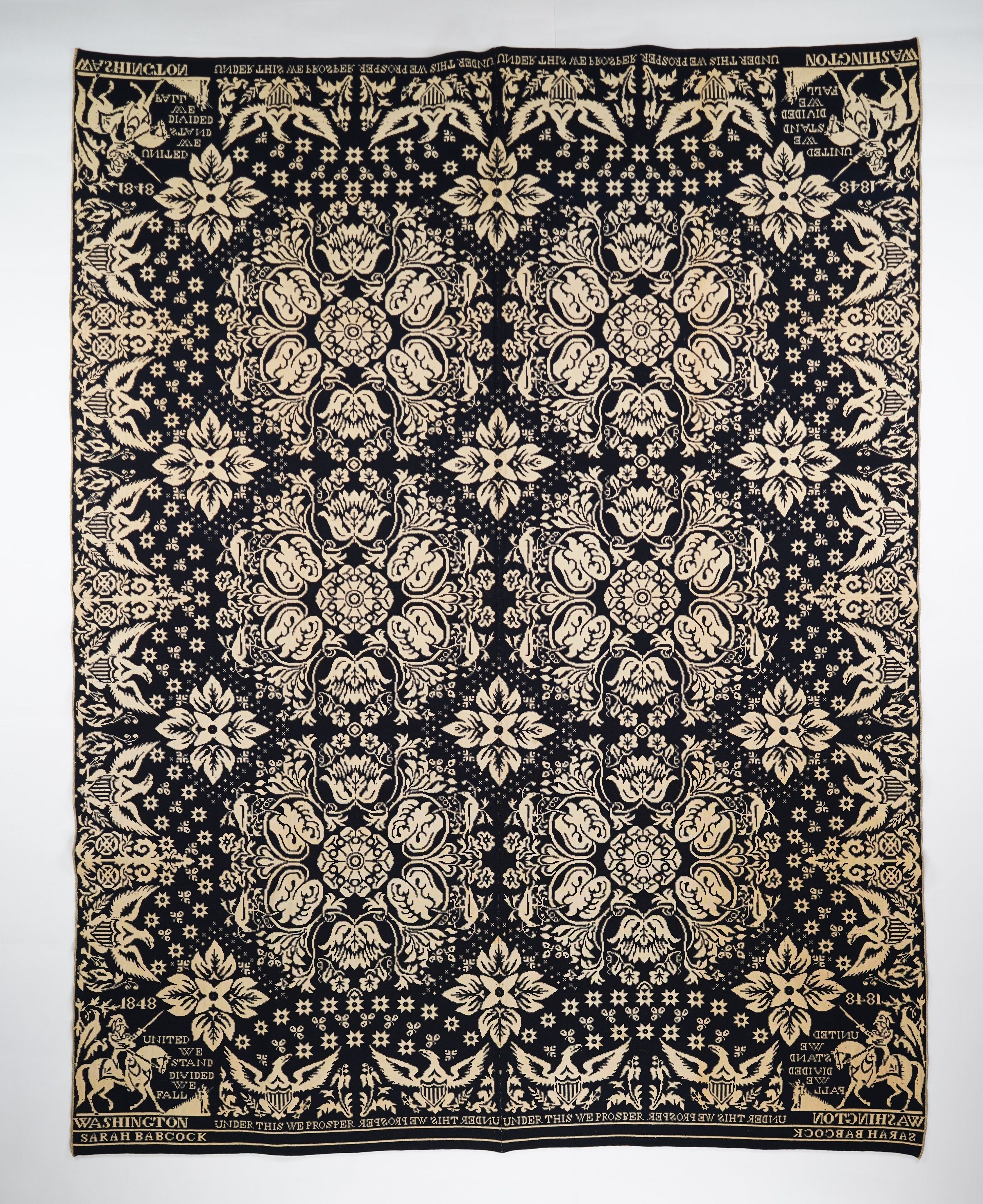 Navy and natural figured doubleweave coverlet with border on four sides. Two joined panels. Woven for Sarah Babcock in New York in 1848.Context