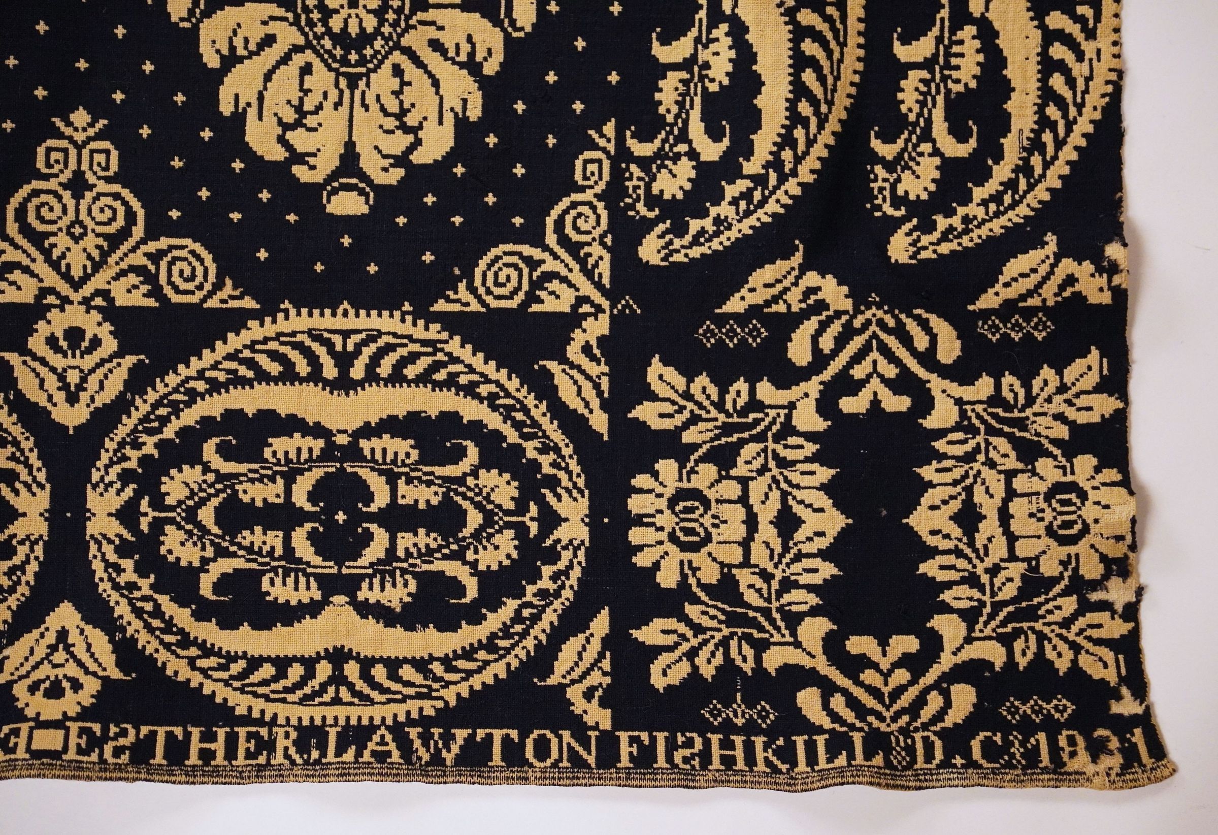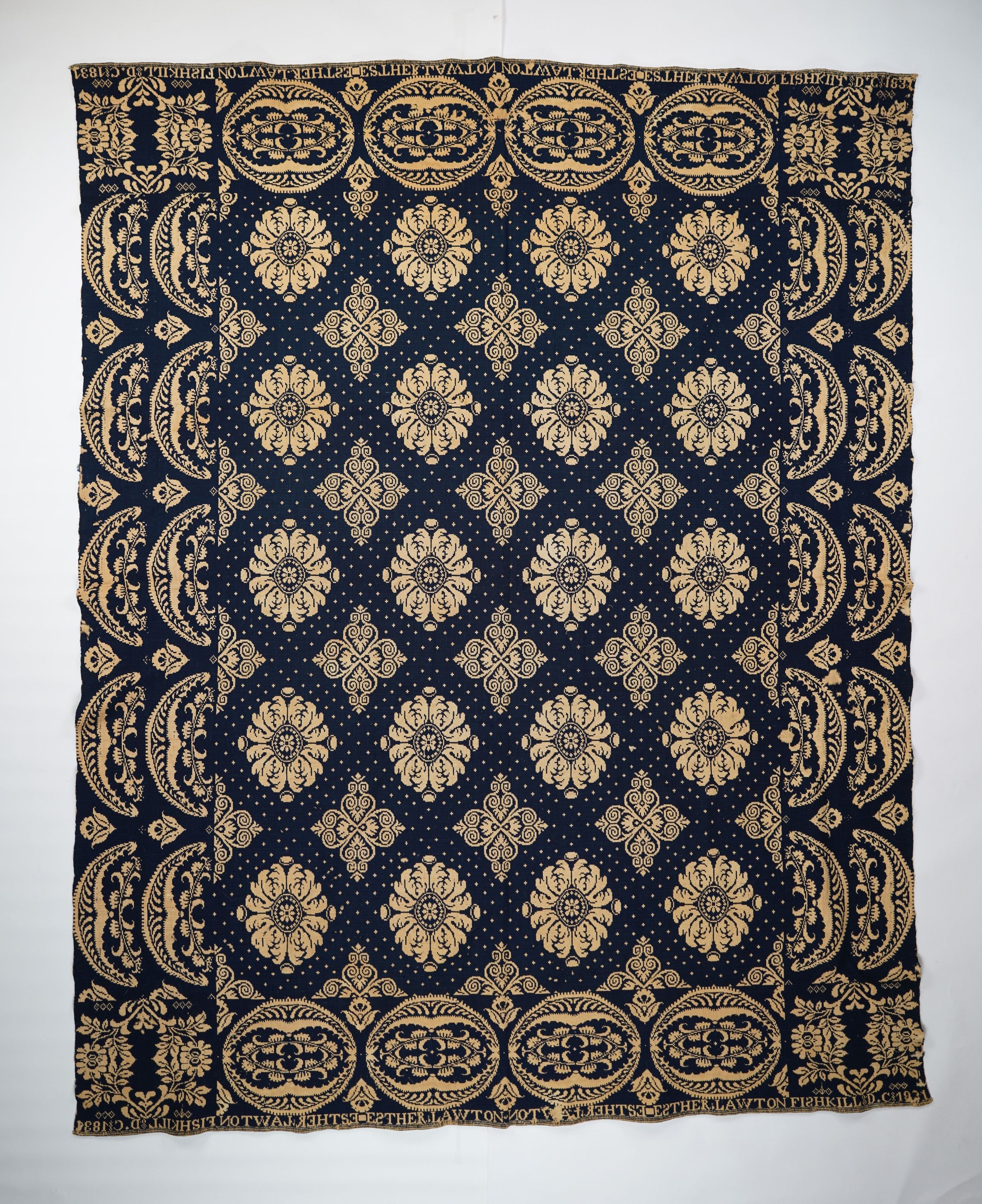 Navy and natural figured double weave coverlet with border on four sides. Seamless. Woven for Esther Lawton in Fishkill, Dutchess Co., New York in 1834.Collection