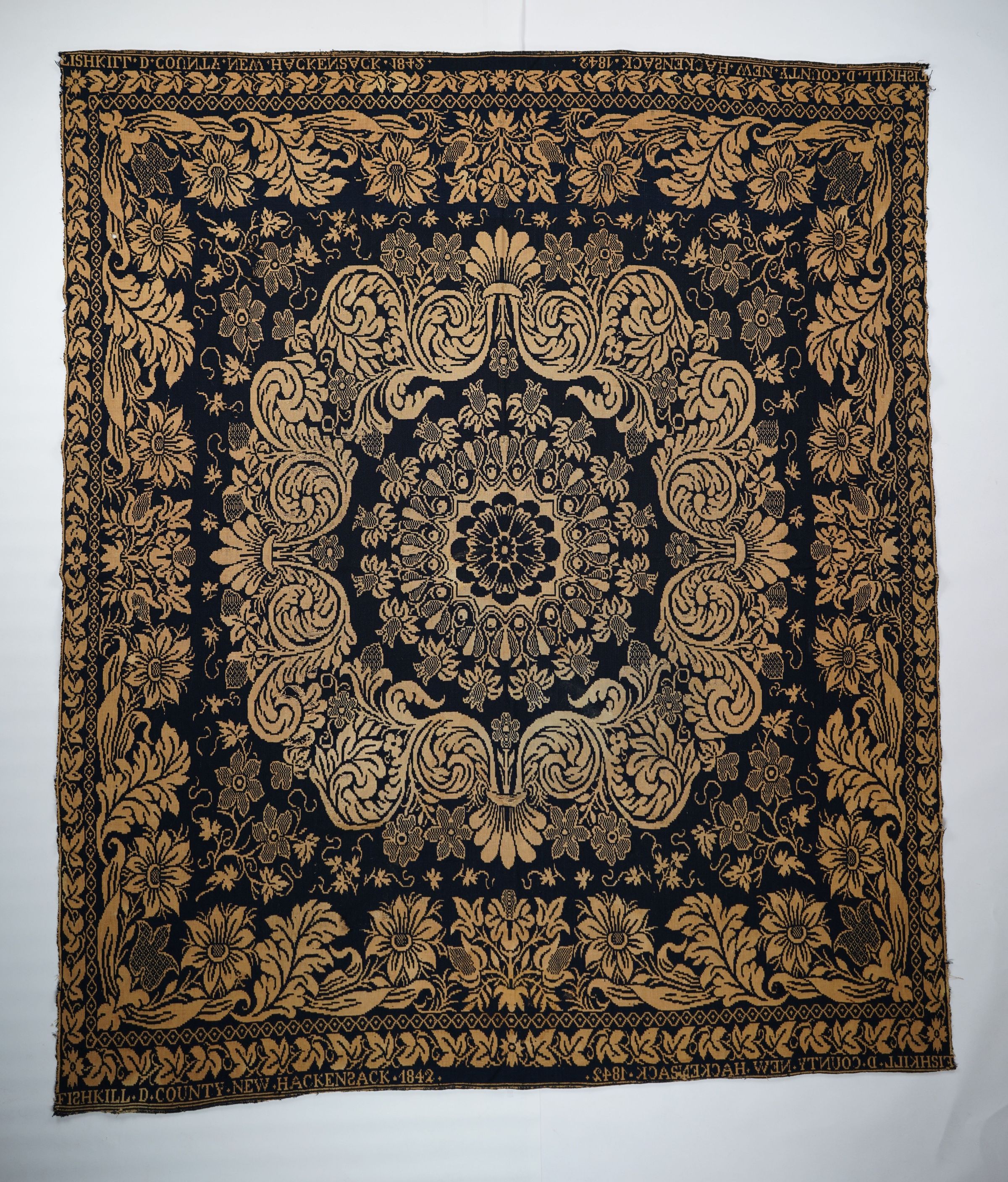 Navy and natural figured double weave coverlet with large center medallion. Seamless. Woven in Fishkill or New Hackensack, Duchess Co., New York in 1842.Collection