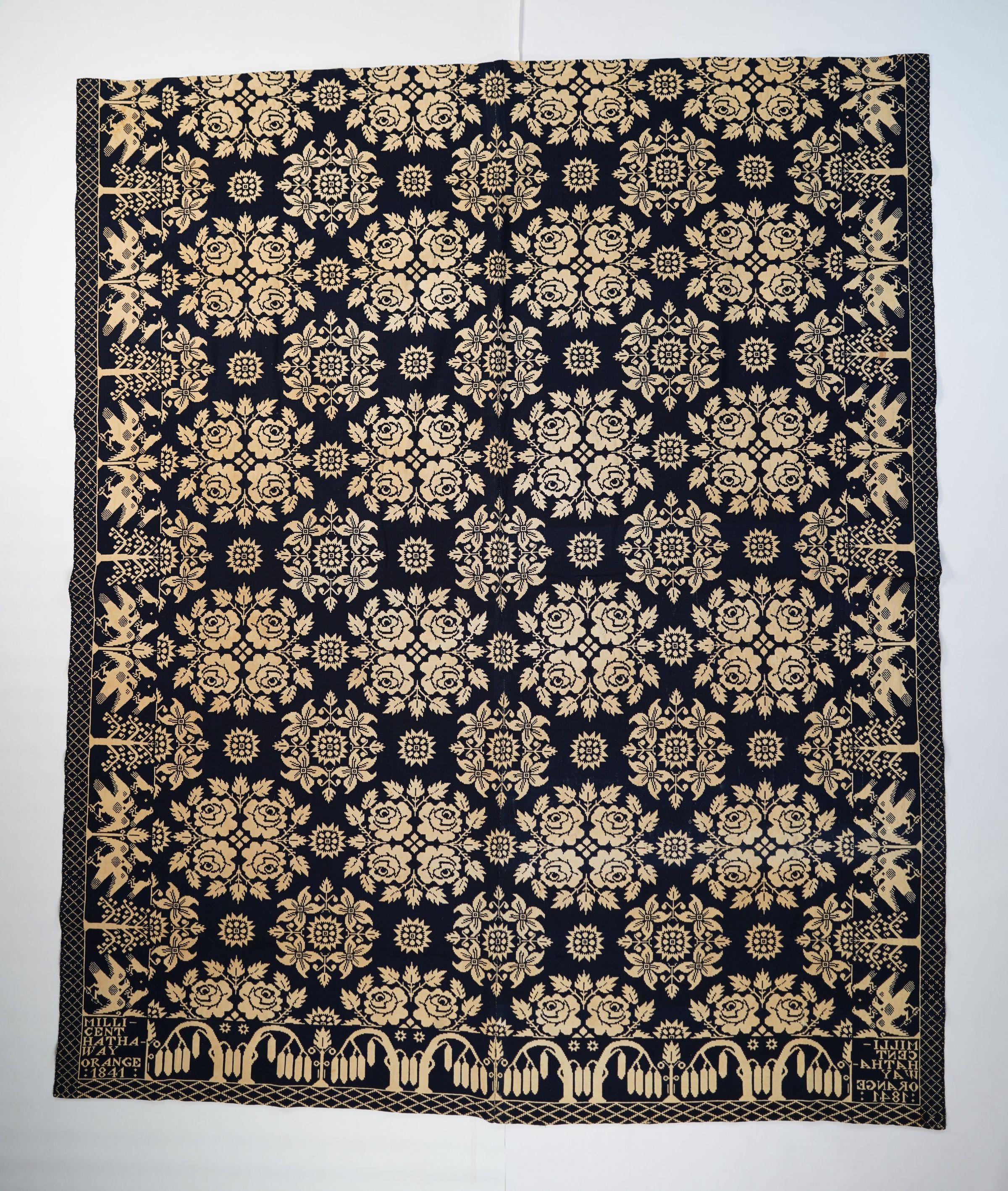 Navy and natural figured double weave coverlet with border on three sides. Woven for Millicent Hathaway by Paul Goltry (attr.) in Orange, Schuyler Co., New York in 1841.Collection