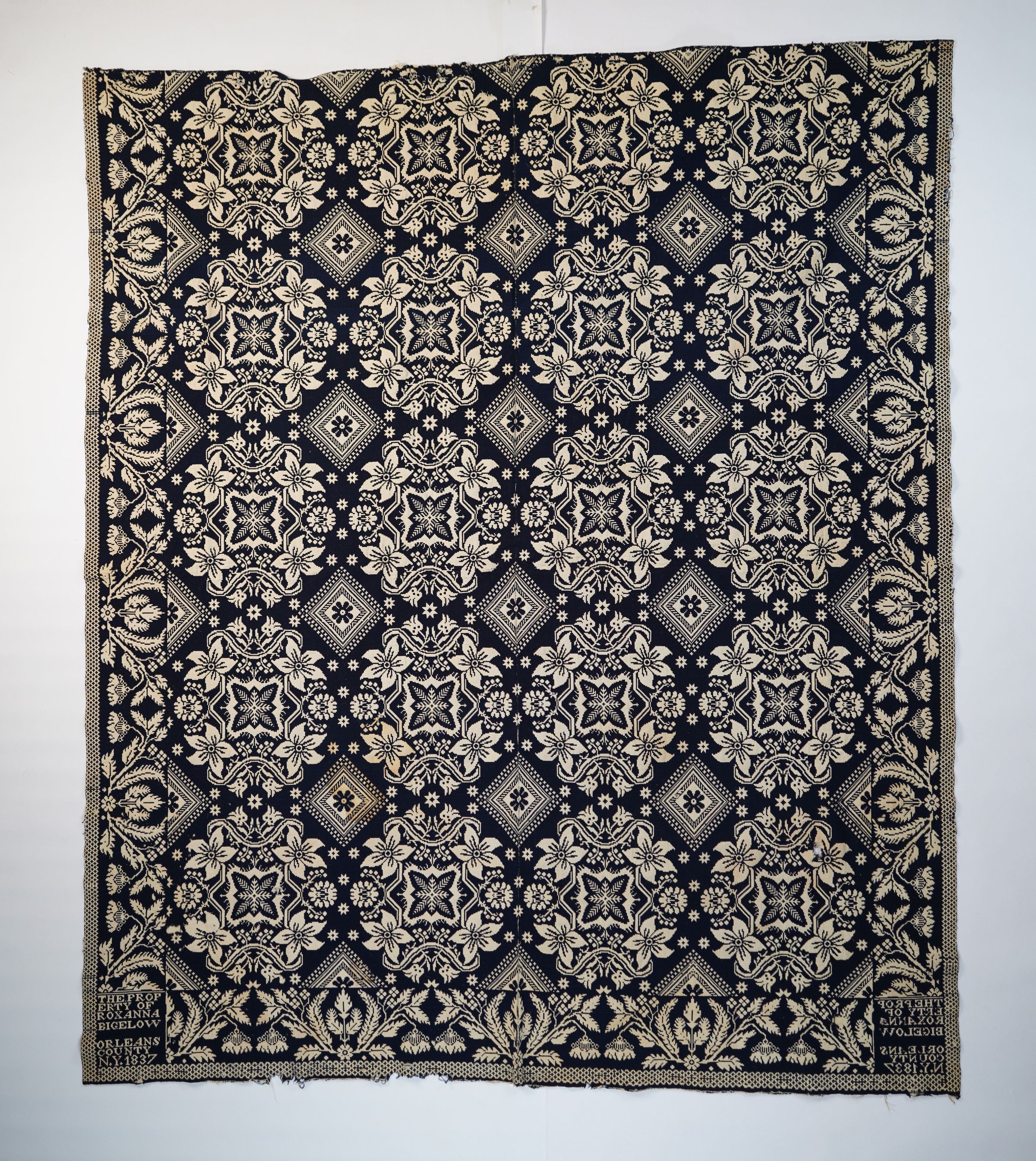 Navy and natura; figured double coverlet with border on three sides. Two joined panels. Woven in Orleans Co., New York in 1837 for Roxanna Bigelow (1812 - 1897) of Millville, Orelans Co., New York.Collection