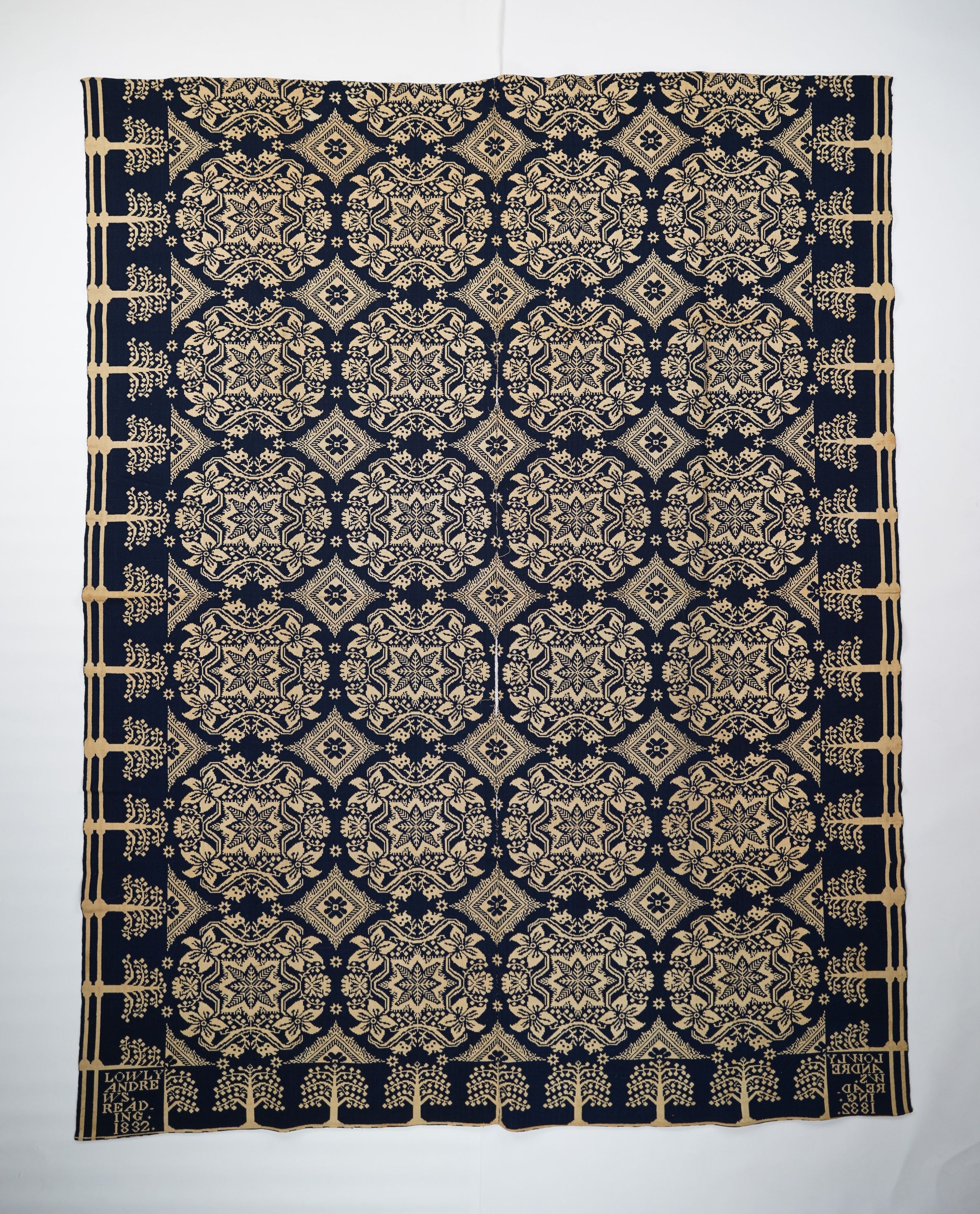 Navy and natural figured doublecloth coverlet with border on three sides. Two joined panels. Woven for Lowly Andrews in Reading, Schuyler Co., New York in 1832.Collection