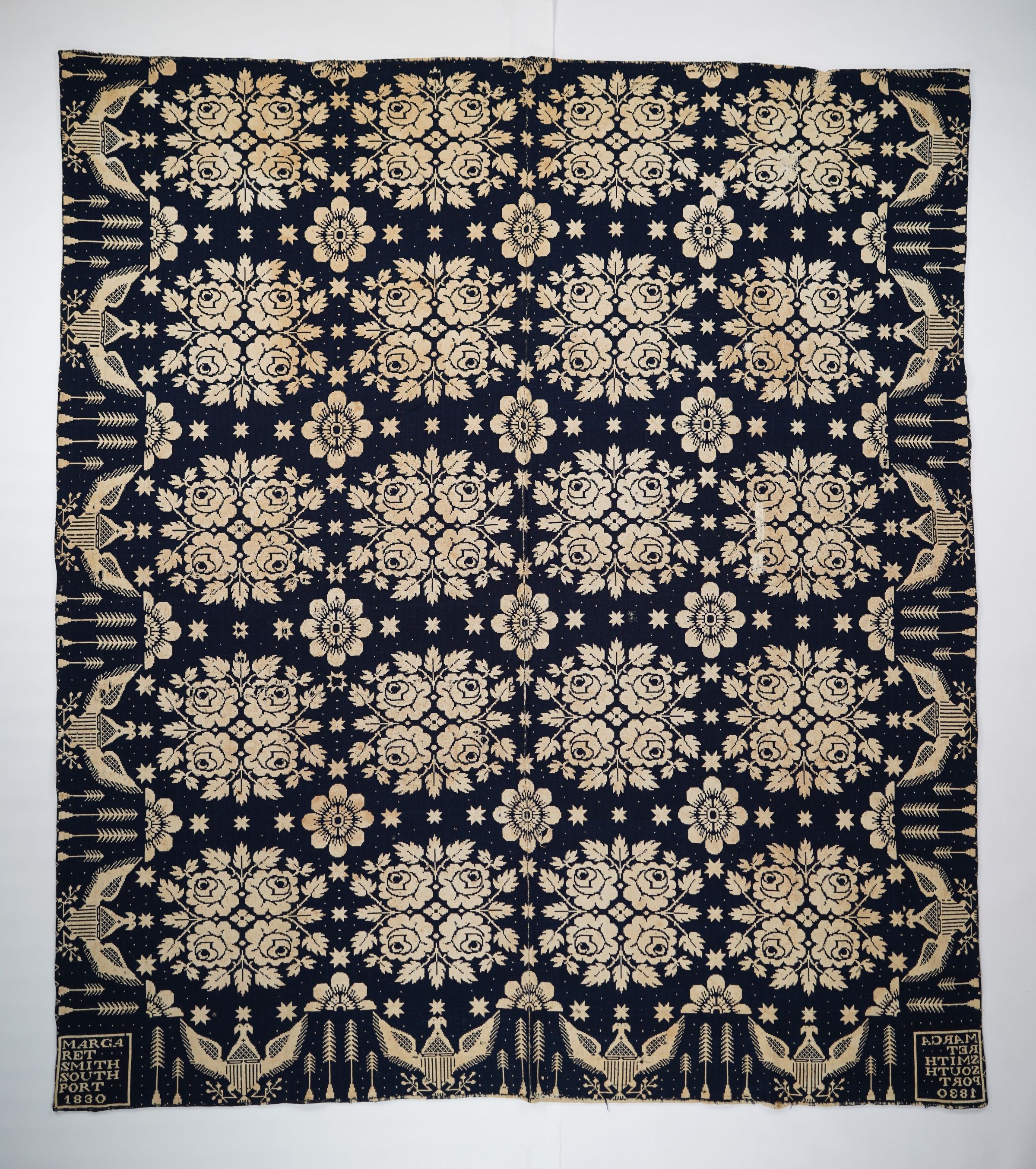 Navy and natural figured double weave coverlet with double-headed eagle border on three sides. Two joined panels. Woven for Margaret Smith in Southport, Chemung Co., New York in 1830.Collection