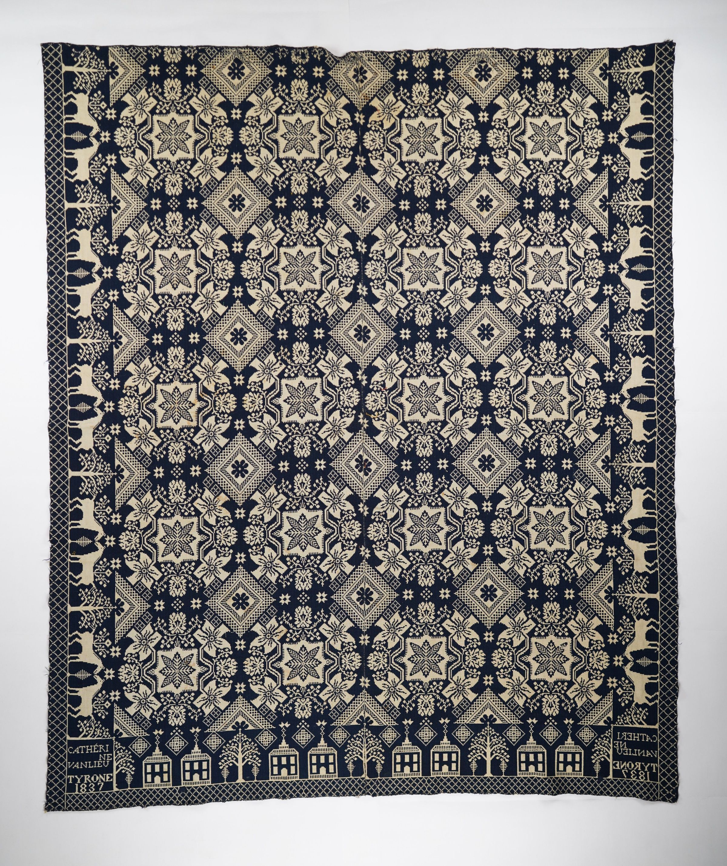 Navy and natural figured doubleweave coverlet with border on three sides. Two joined panels. Woven for Catherine Vanlieu (Van Lieu/Liew) in Tyrone, Schuyler Co., New York in 1837.Context