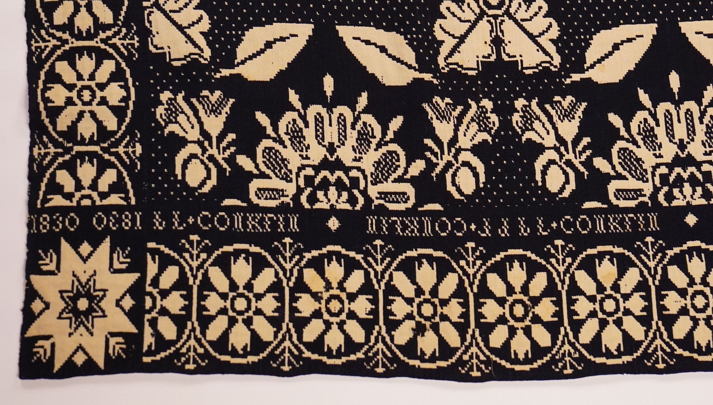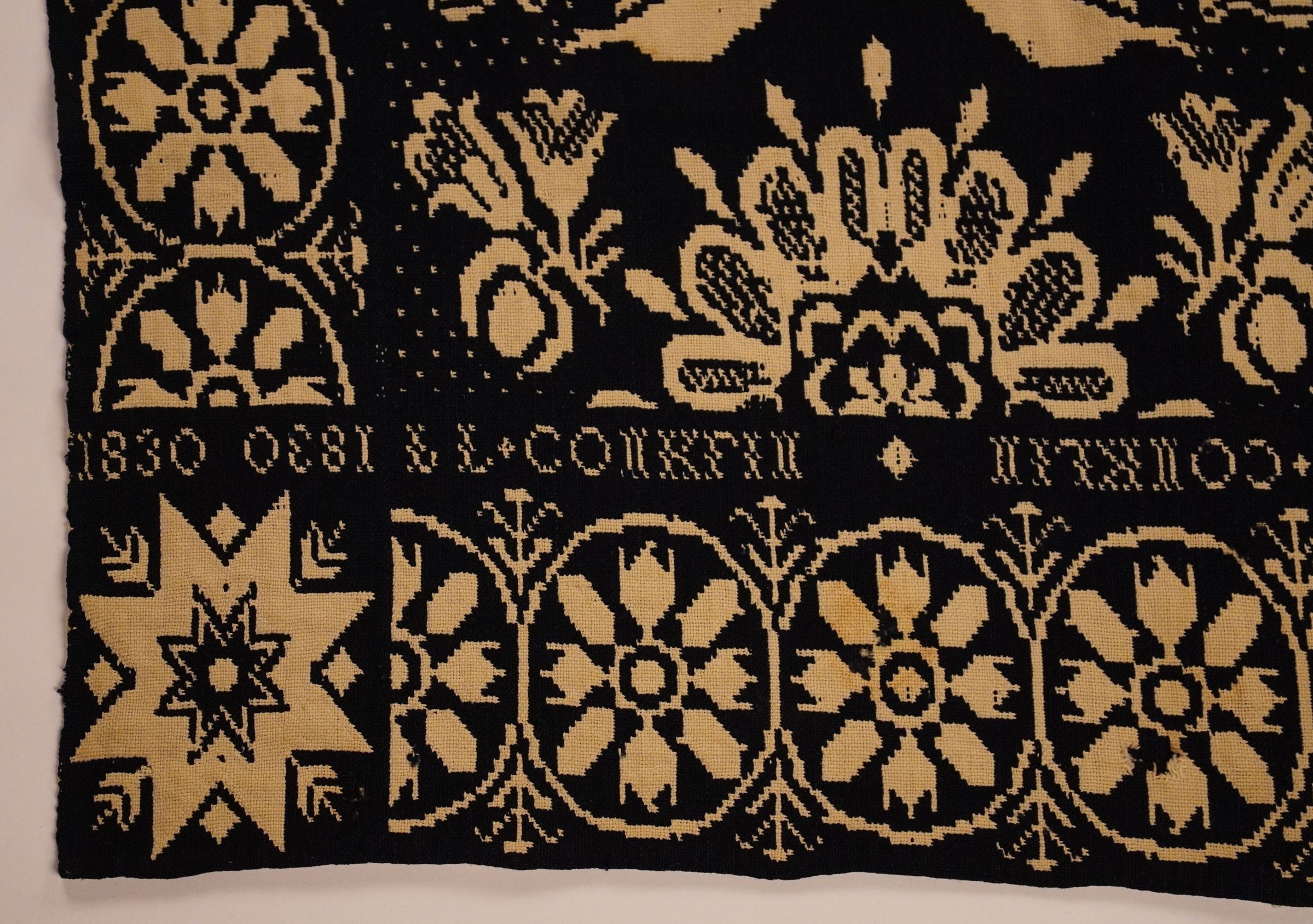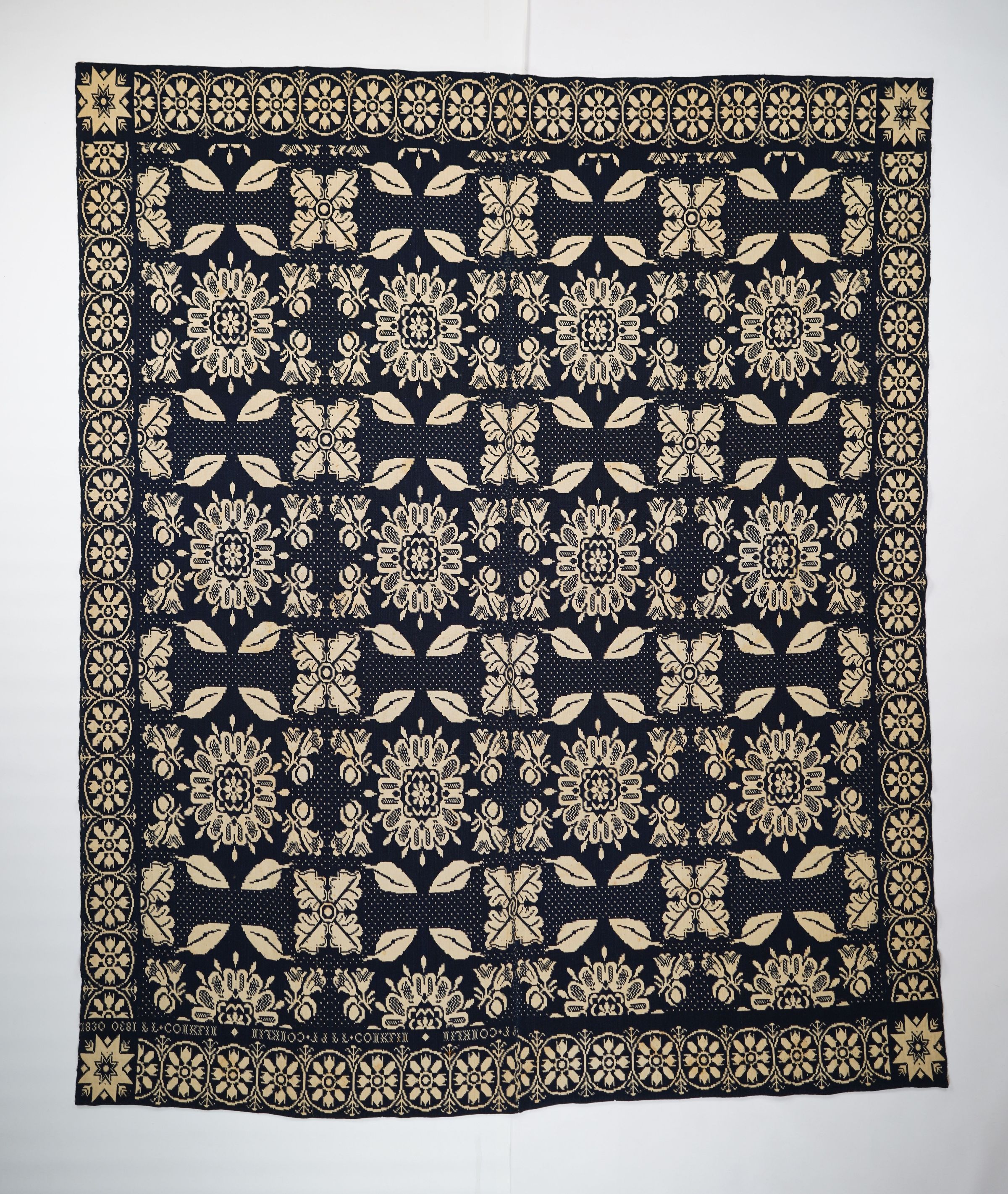 Navy and natural figured double weave coverlet with border on four sides. Two joined panels. Woven for L. L. Conklin in 1830.Collection