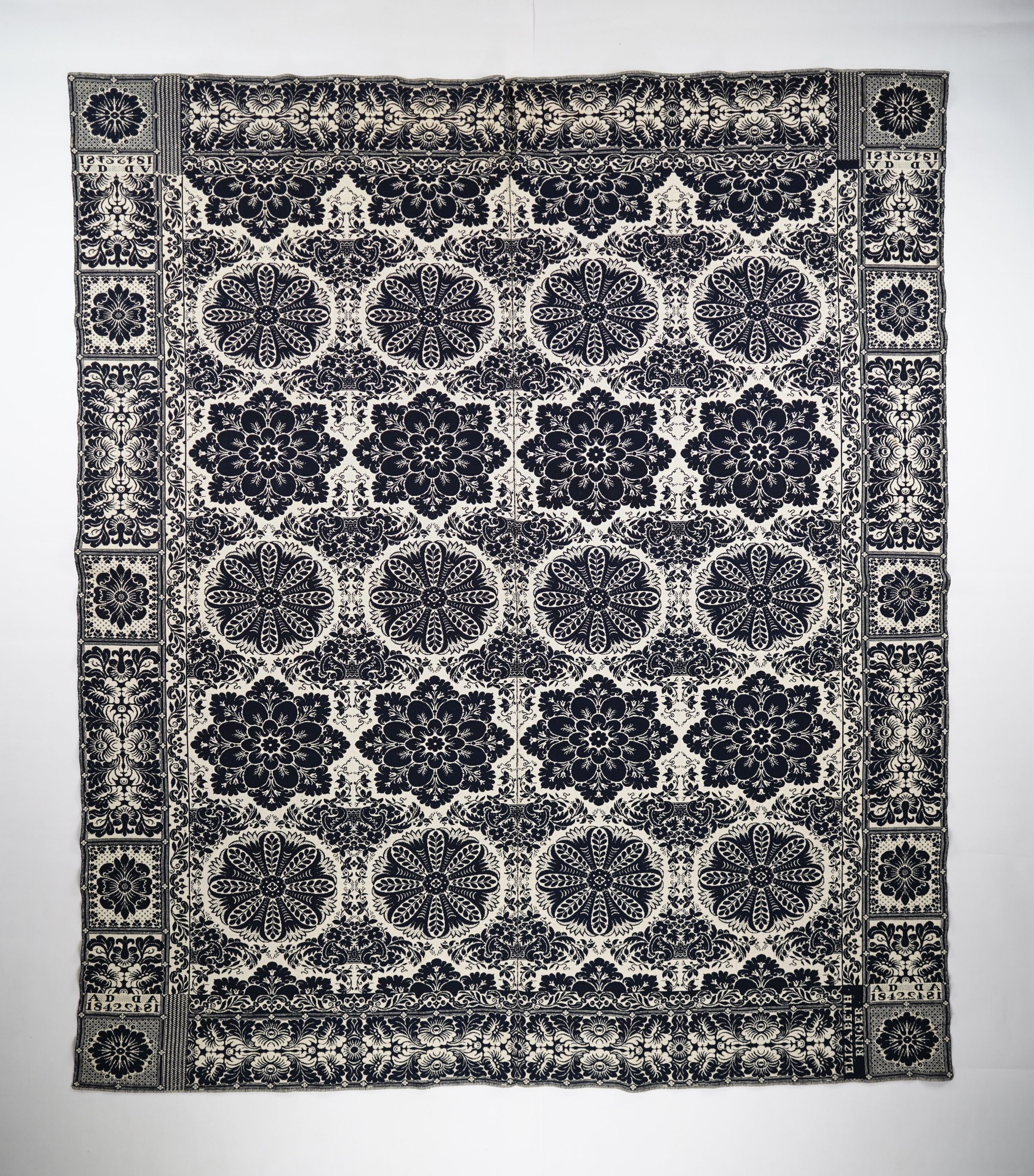 Figured and fancy doubleweave coverlet with borders on 4 sides and no fringe. Two panels joined by a center seam. Navy wool with undyed cotton. Floral medallion centerfield pattern; Abstract border on all sides. Unknown weaver for Elizabeth Ringer in 1842 with floral trademark.Context