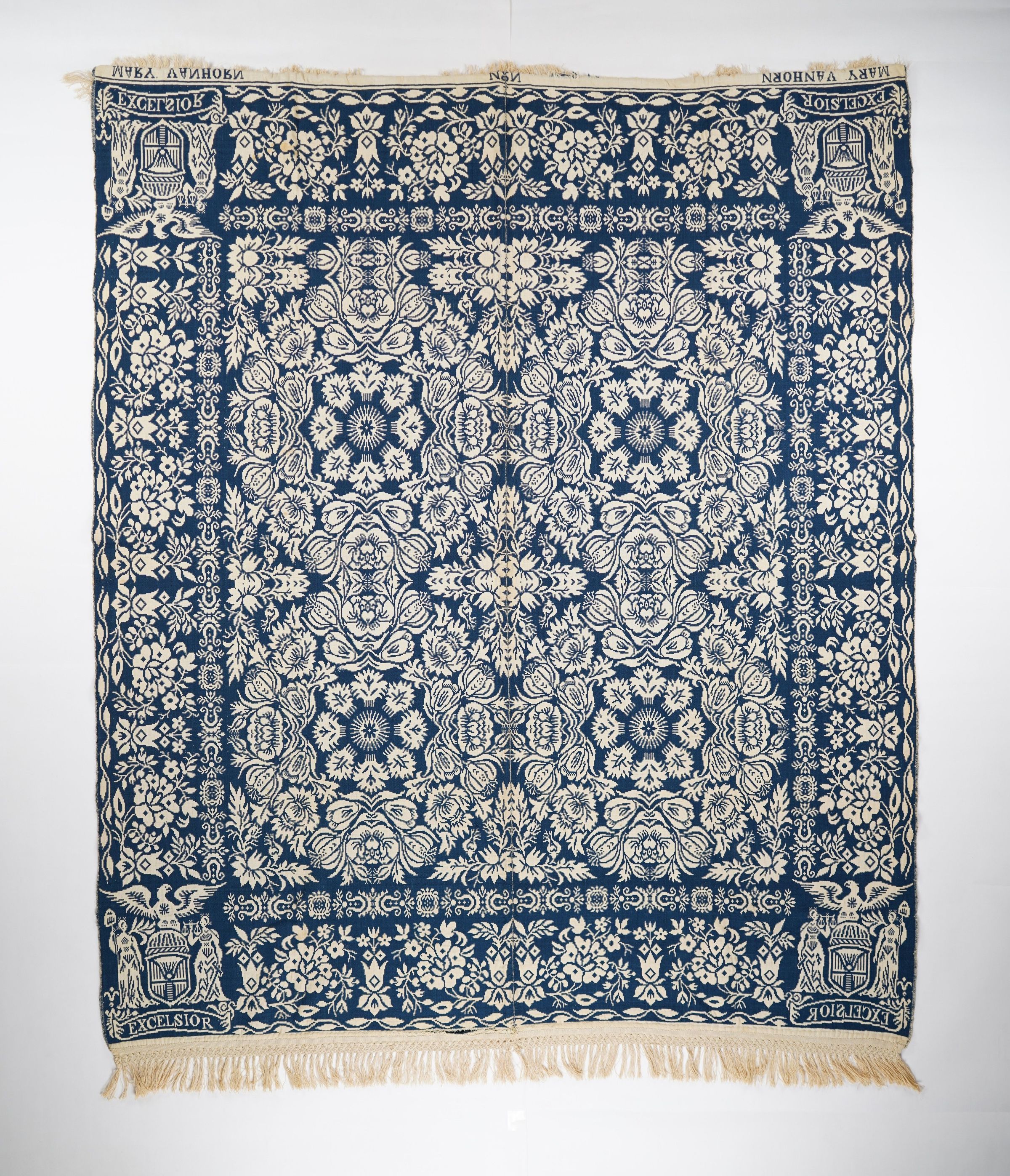 Figured and fancy doubleweave coverlet with borders on 4 sides and self-fringe on the top and applied fringe on the bottom. Two panels joined by a center seam. Navy wool with undyed cotton. Floral medallion centerfield pattern; floral border on all sides. Unknown weaver with "Excelsior" cornerblock.Context