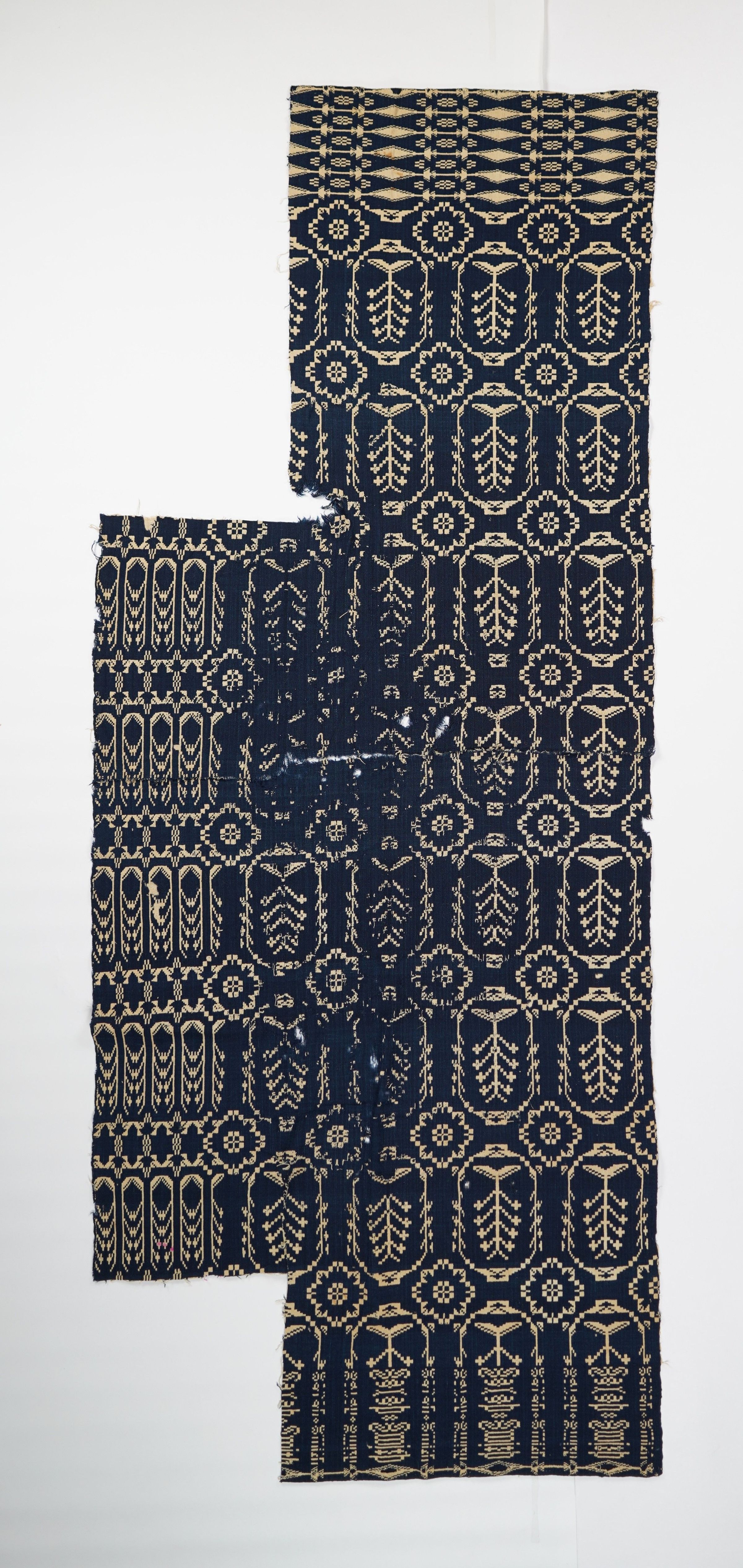 Navy and natural figured double weave coverlet with border on three sides. One panel. Woven for Sarah Smith. Corners have been cut from this panel.Collection