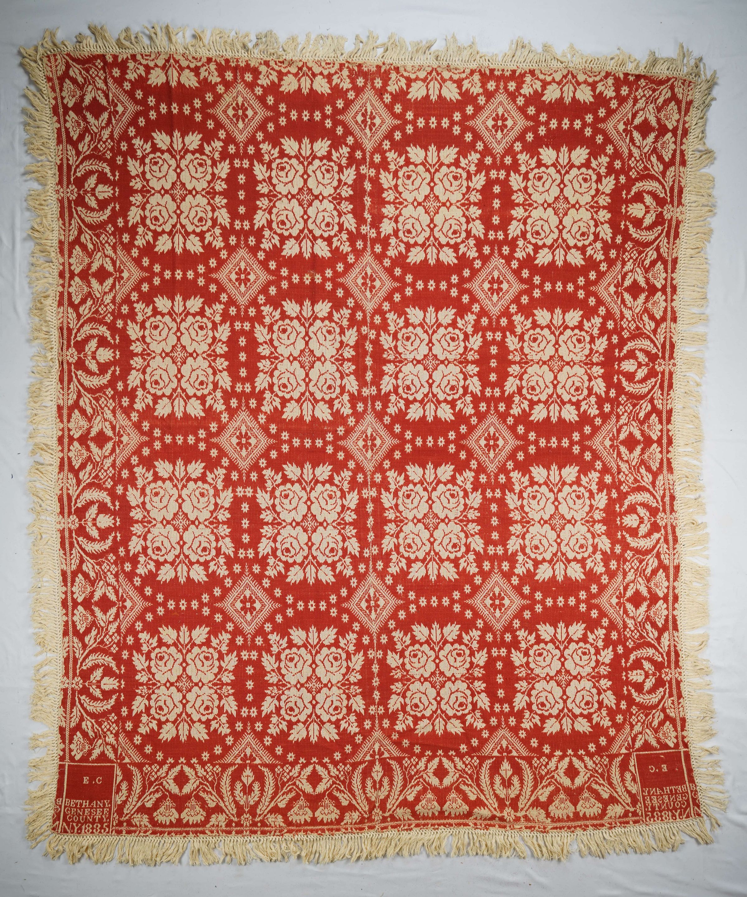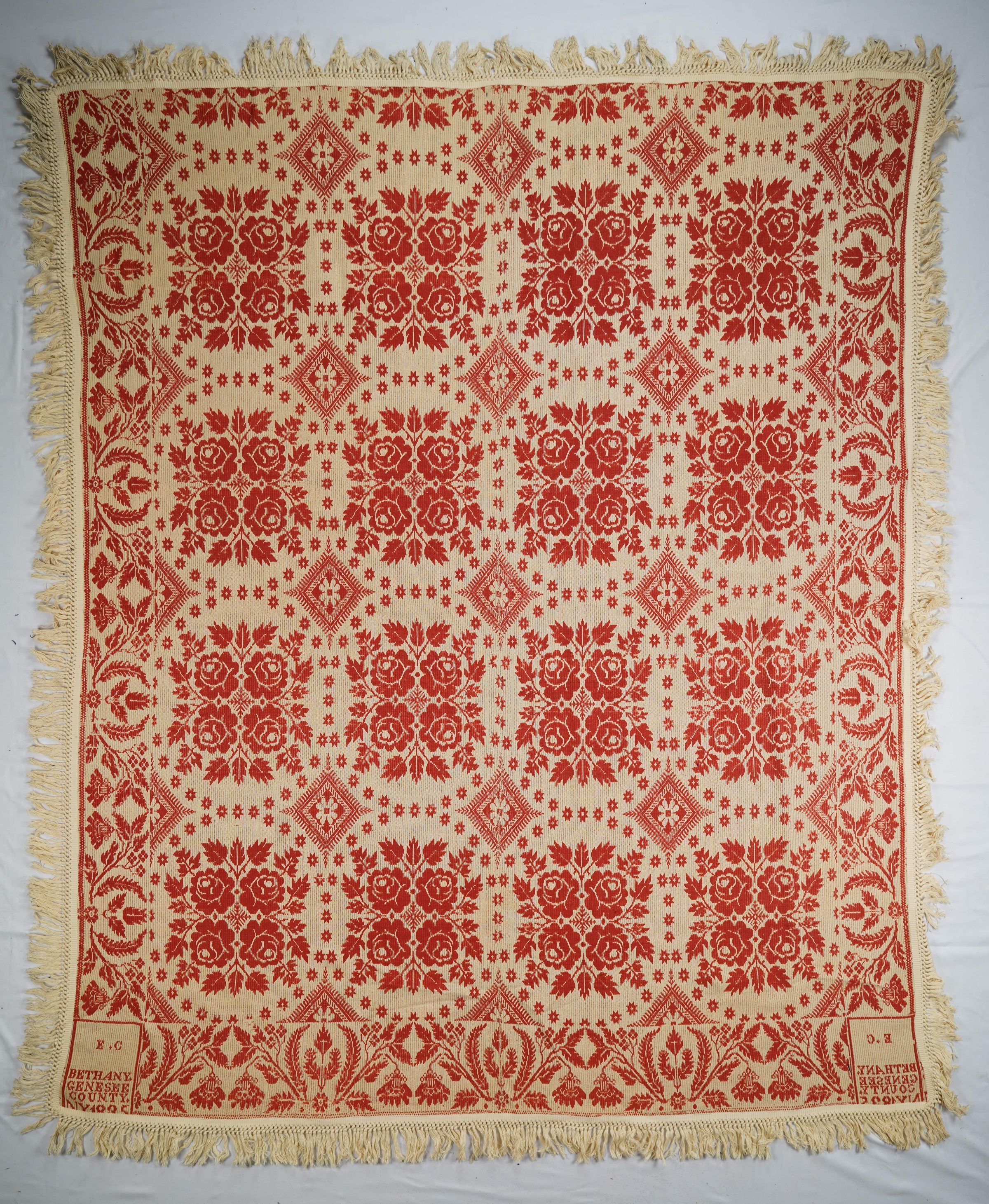Natural and red figured tied Beiderwand 4:1 coverlet; two panels joined by a center seam. Tied fringe on four sides. Border on three sides.Collection