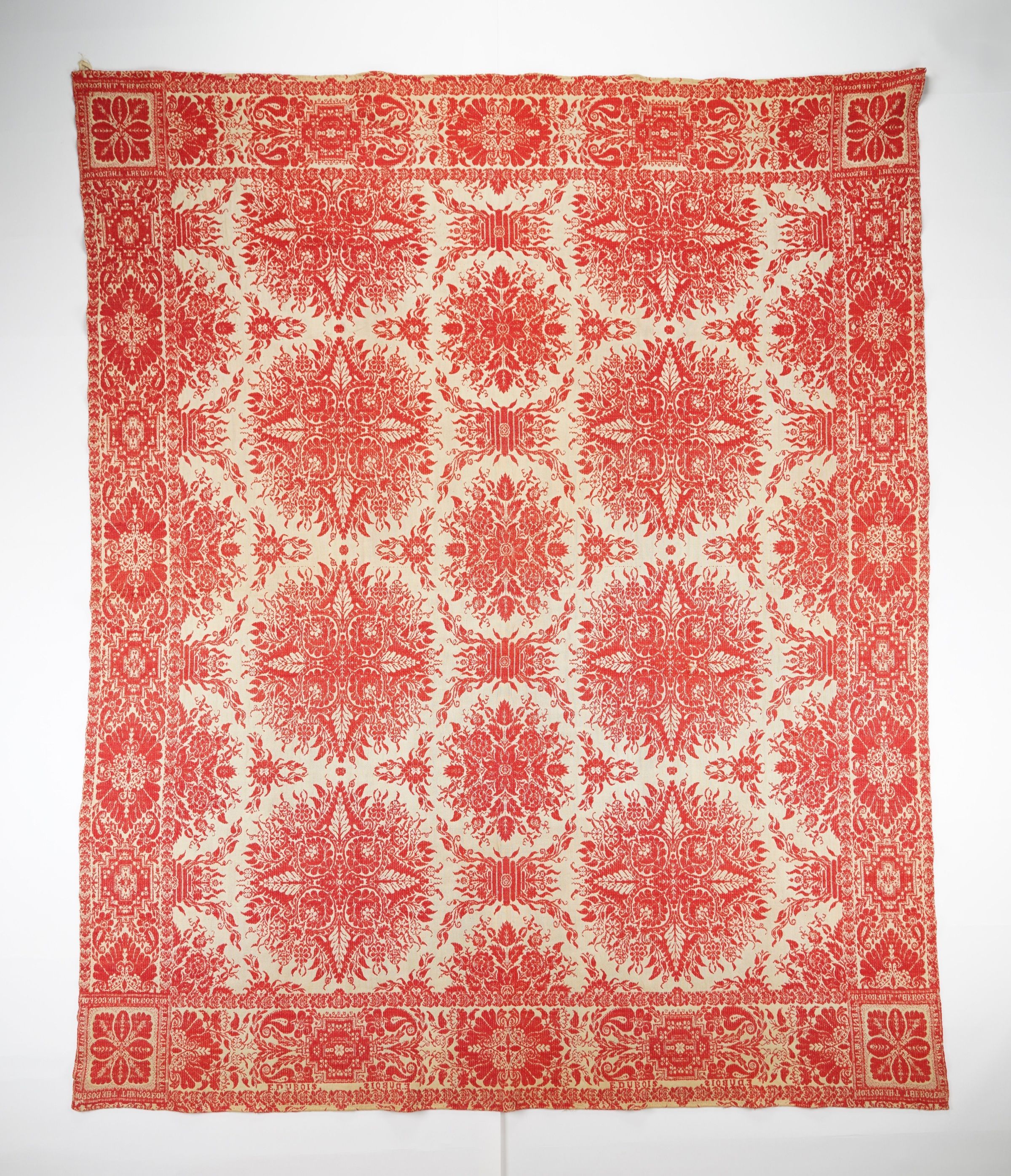 Figured and fancy true beiderwand coverlet with borders on 4 sides and no fringe. Woven full-width; seamless. Red wool with undyed cotton. Ornate leafy medallion centerfield pattern; abstract symmetrical floral border on all sides. Attributed to the Conger family, woven for E. DuBois.Context
