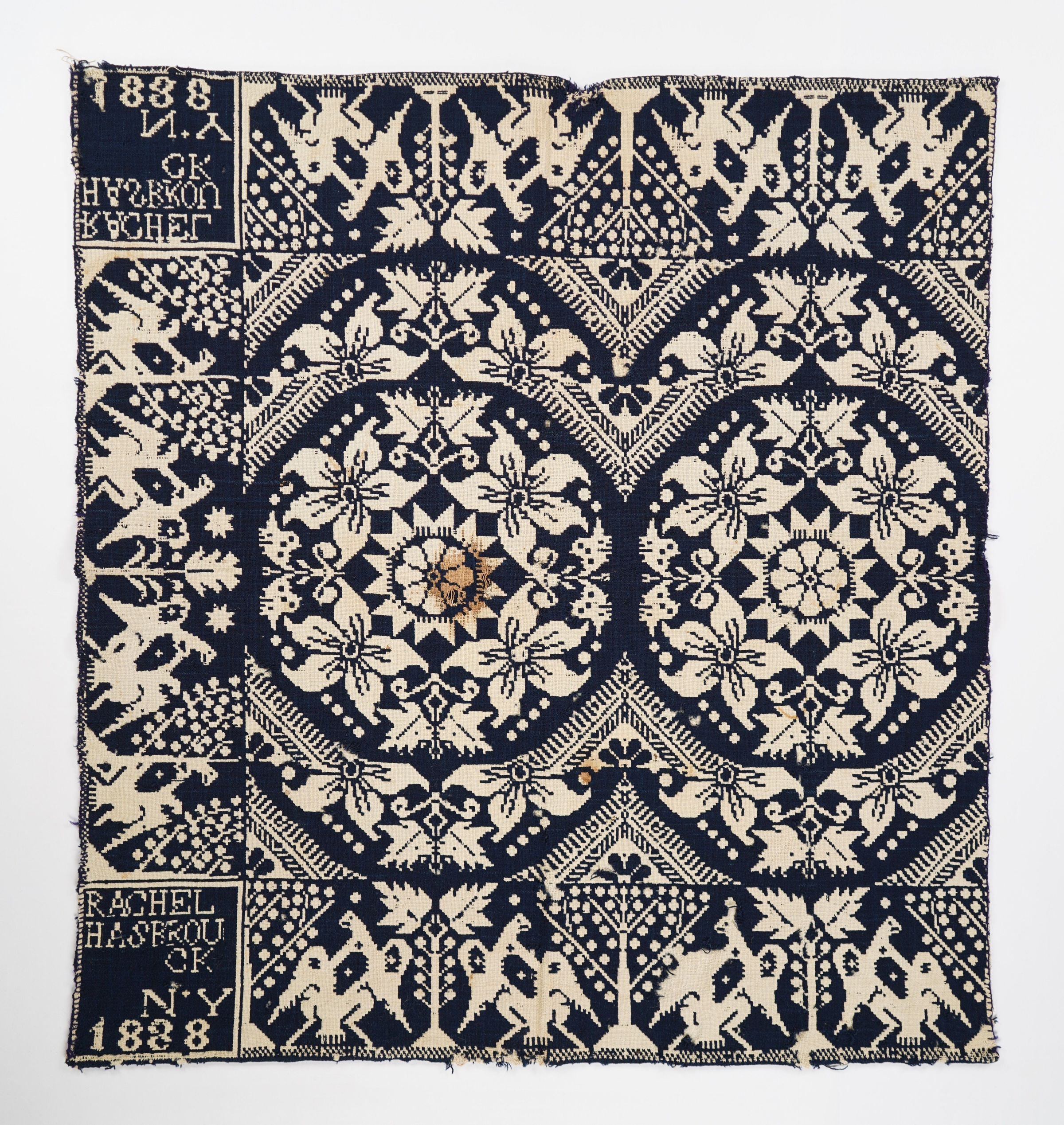 Figured and fancy doubleweave coverlet with borders on 3 sides and no fringe. Woven full-width; seamless. Navy wool with undyed cotton. Lilies of France centerfield pattern; eagle border on sides and bottom. Unknown weaver for Rachel Hasbrouck in 1838.Context