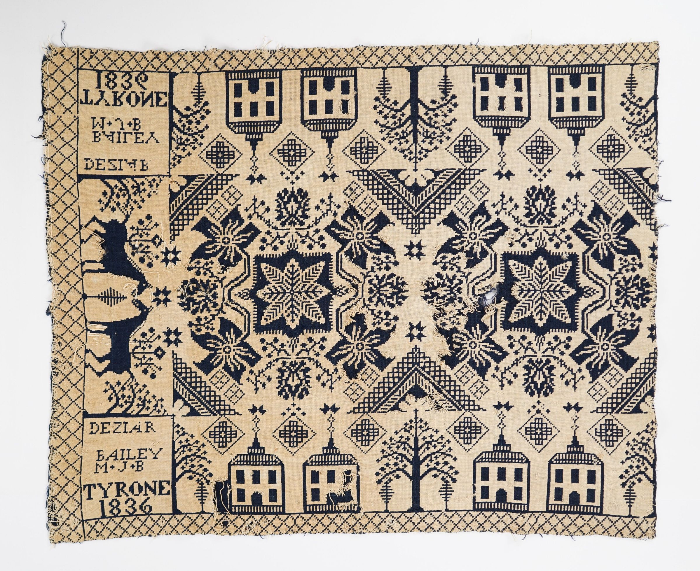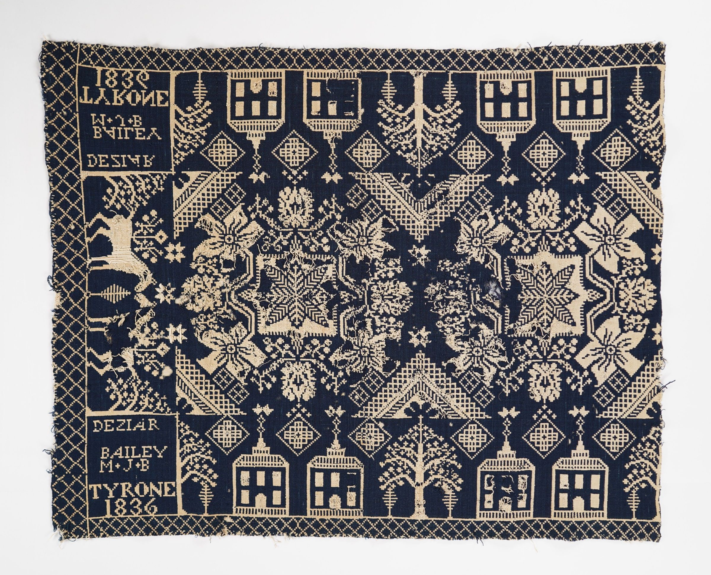 Figured and fancy doubleweave coverlet with borders on 3 sides and no fringe. Woven full-width; seamless. Navy wool with undyed cotton. Floral centerfield pattern; building border on sides; horse border on bottom. Unknown weaver for Deziar Bailey in 1836.Context
