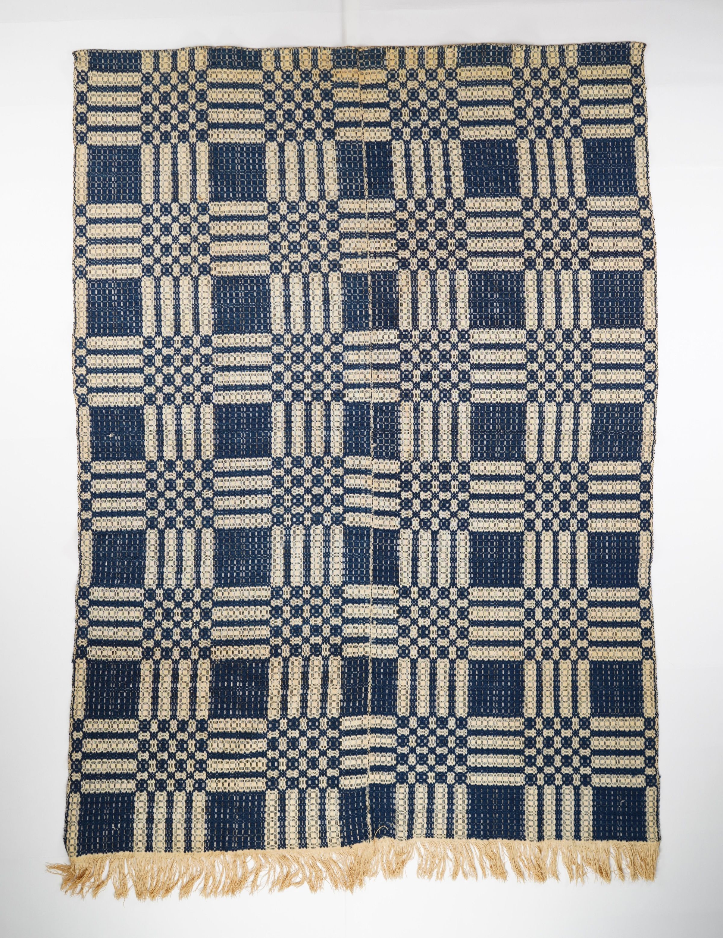 Geometric overshot coverlet with self-fringe on bottom. Two panels joined by a center seam. Navy wool with undyed cotton. Abstract centerfield pattern. Unknown weaver.Context