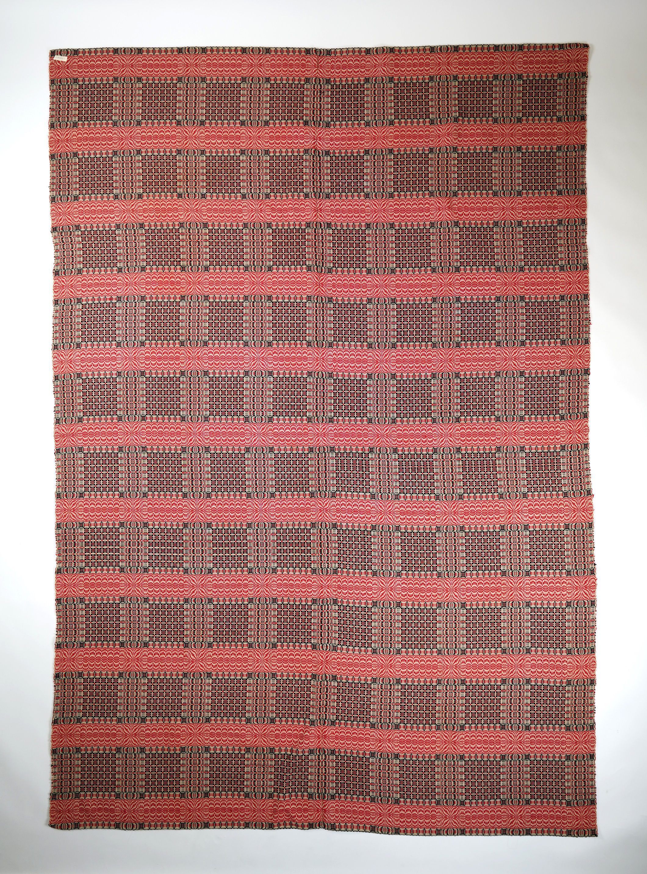 red, white and blue yarns; 2 pieces joined at a center seam; geometric overshot pattern that possibly includes the "Window Sash" and "Double Bow Knot" designs; no fringe and no corner blocksCollection