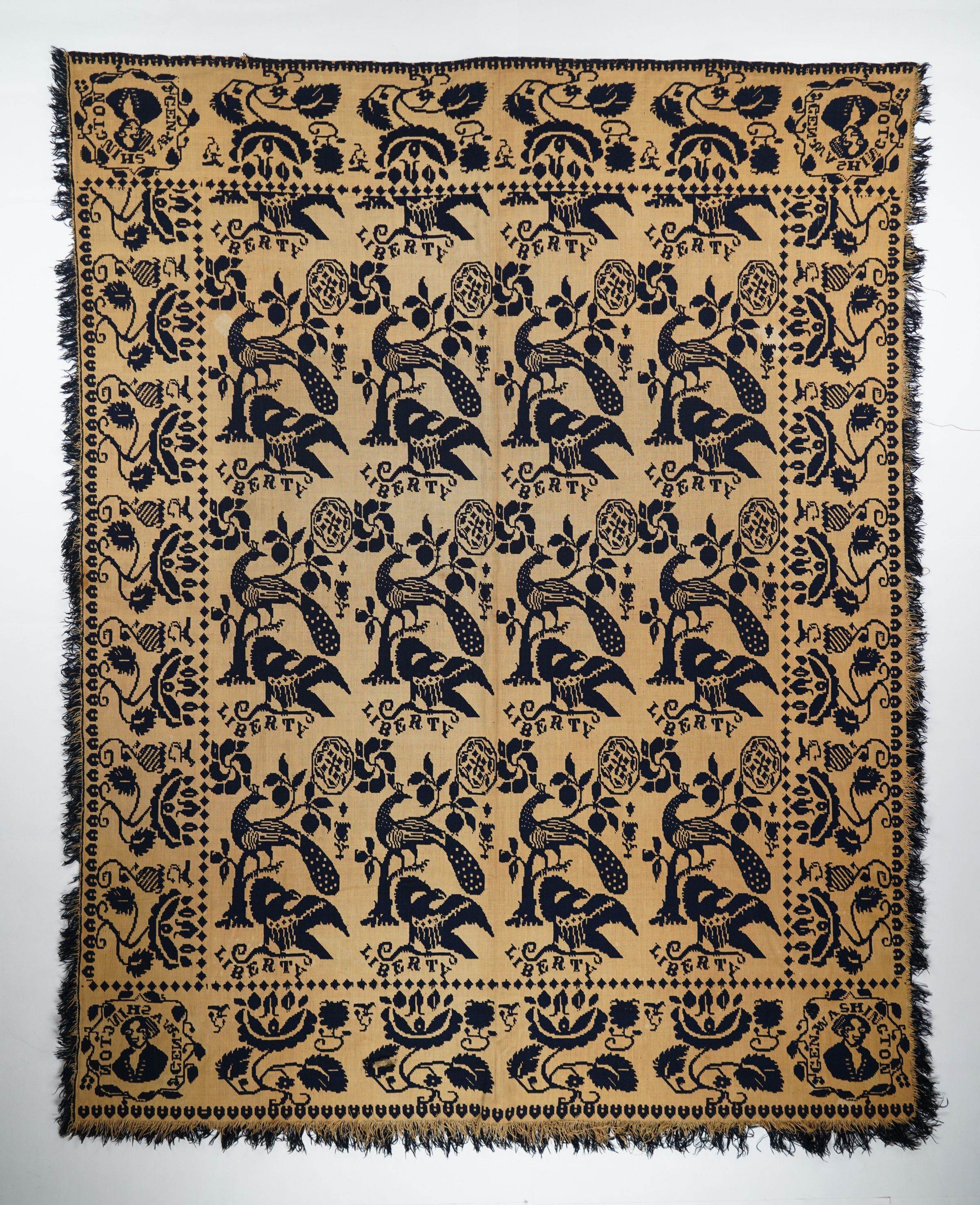 Figured and fancy doubleweave coverlet with borders on all sides and self-fringe on sides and bottom. Woven full-width; seamless. Navy wool with undyed cotton. Libertyville peacocks centerfield pattern; floral border on sides and bottom. Unknown weaver.Context