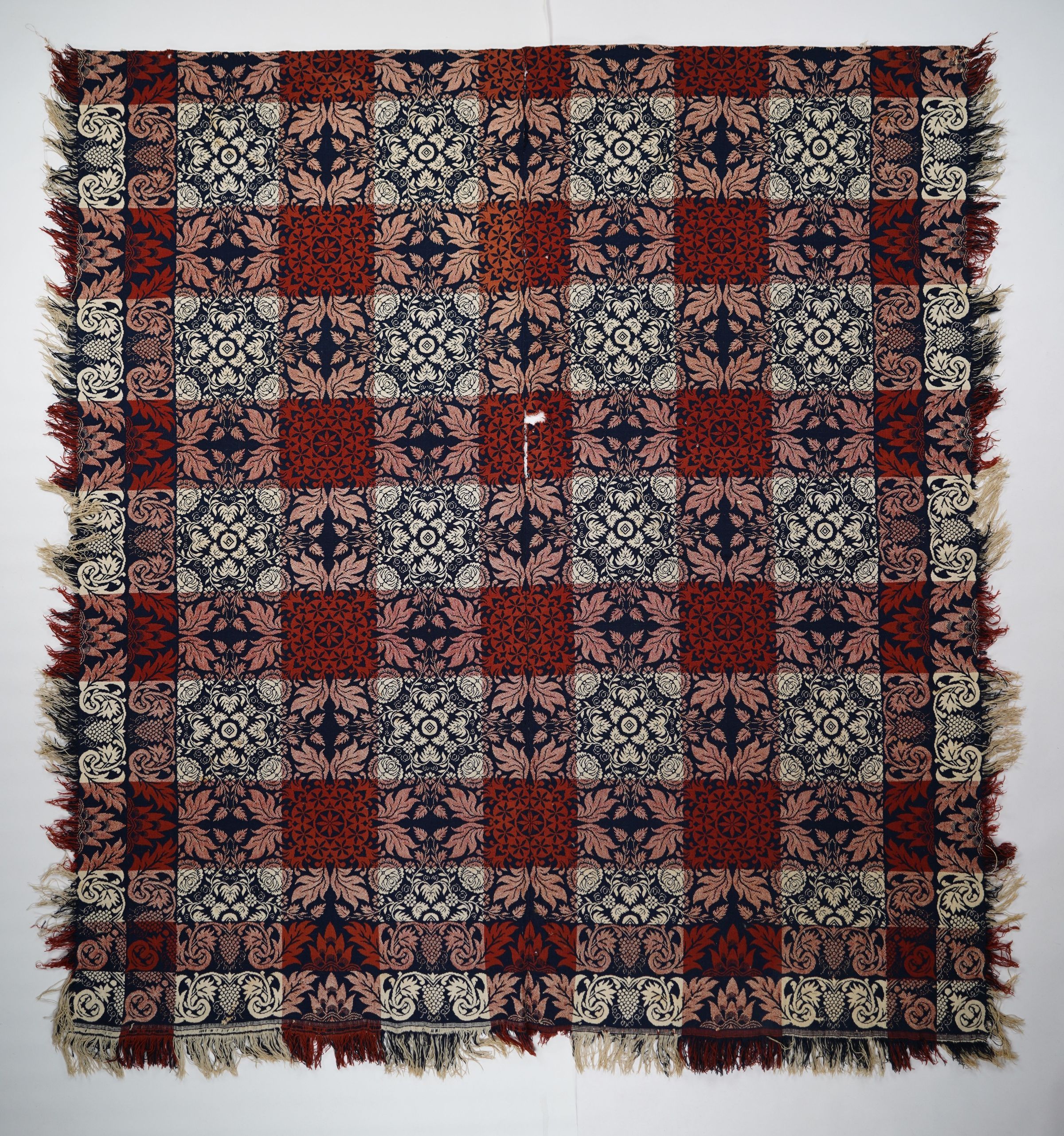 Red, navy, and natural figured doublecloth coverlet with border and self-fringe on three sides. Two joined panels.