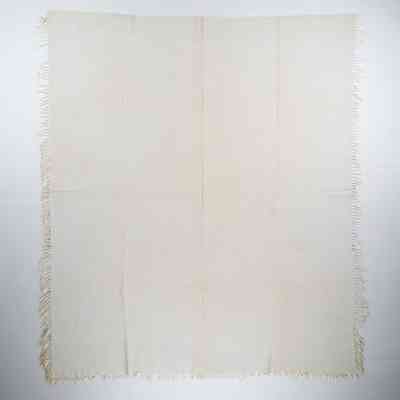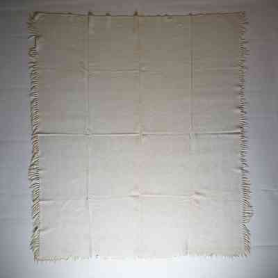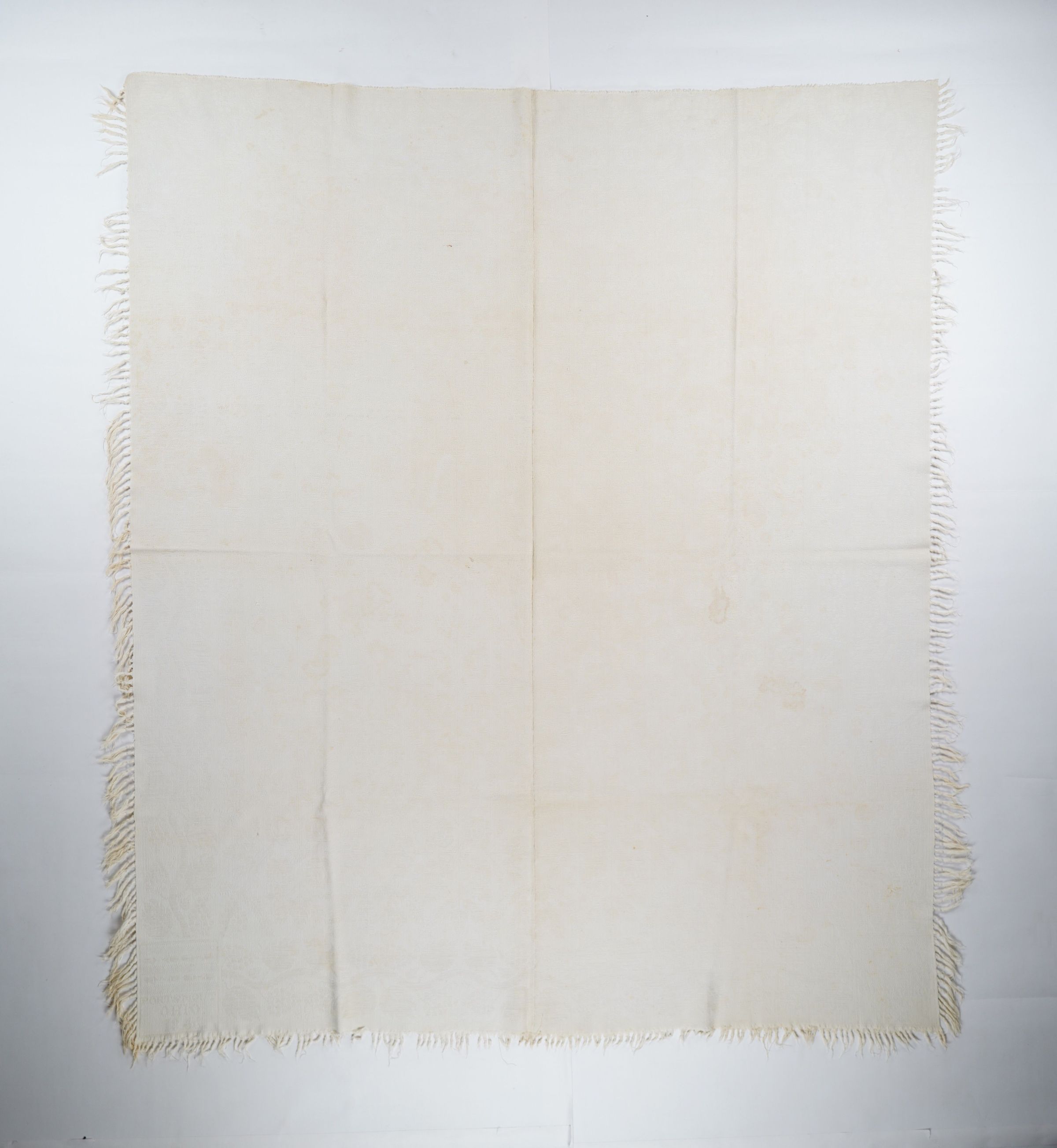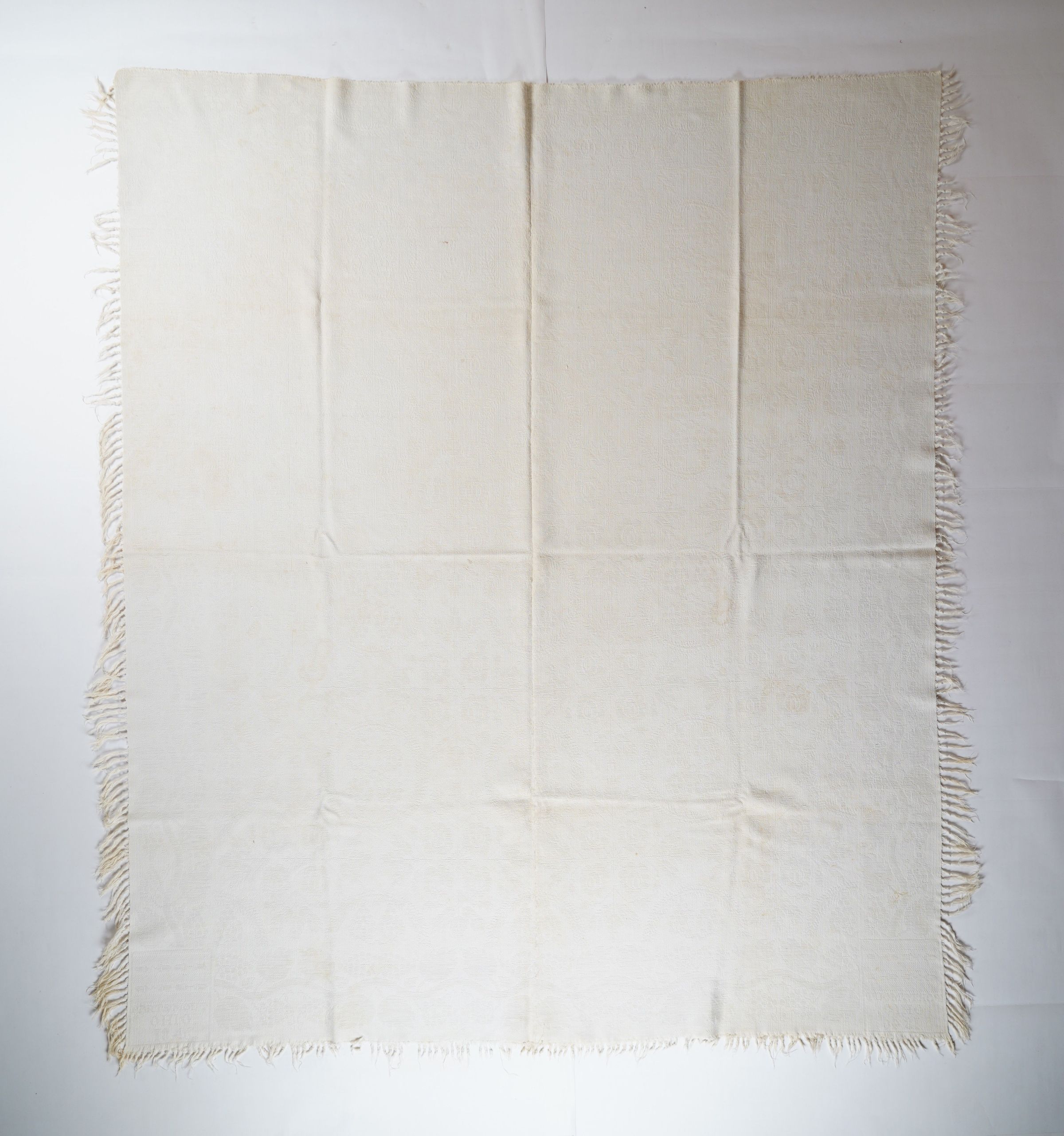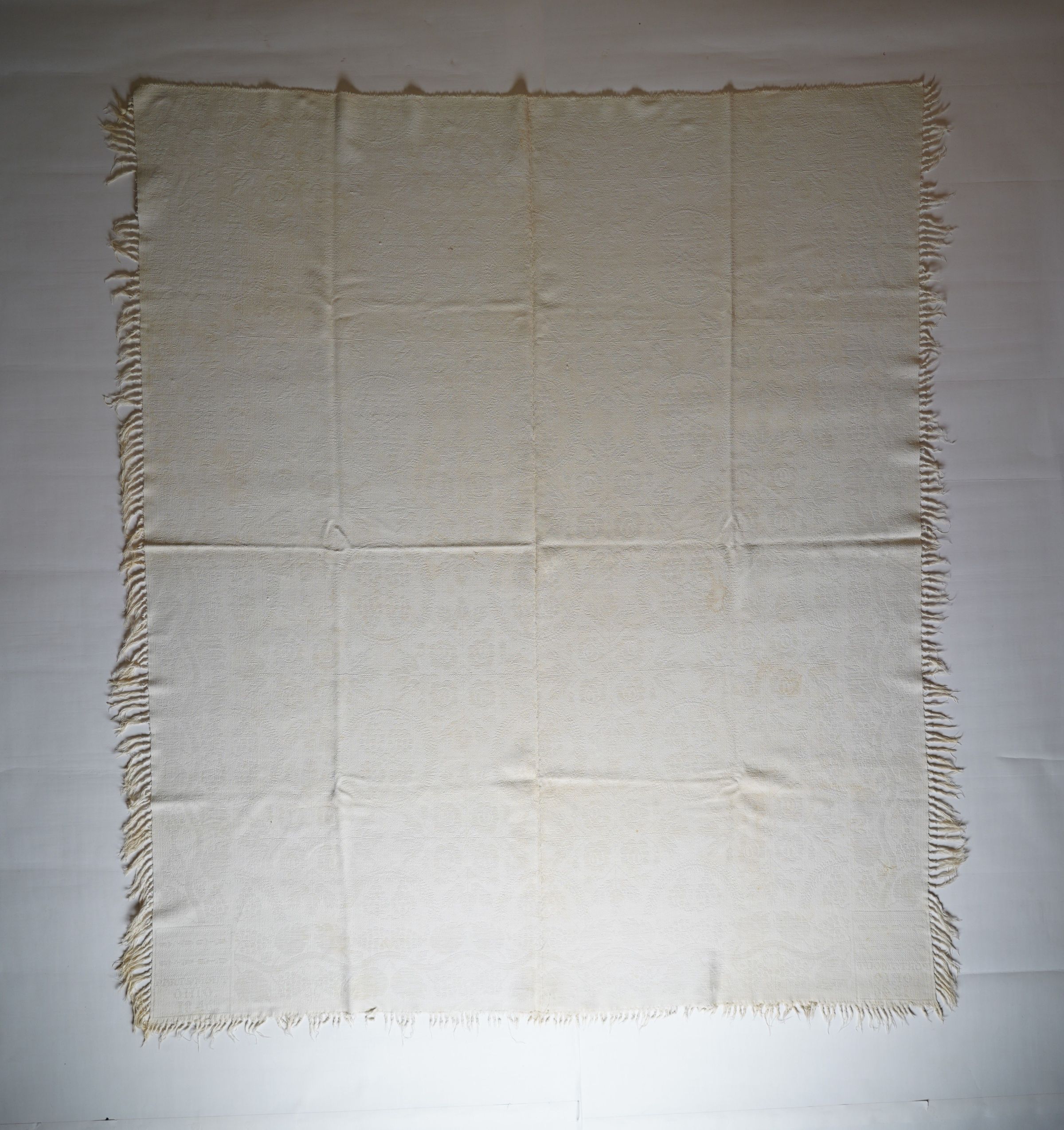 Figured and fancy tied beiderwand coverlet with borders on 3 sides and self-fringe on sides and bottom. Two panels joined by a center seam. Natural wool with undyed cotton. Double rose centerfield pattern; grapevine border on sides and bottom. Unknown weaver in 1846.Context