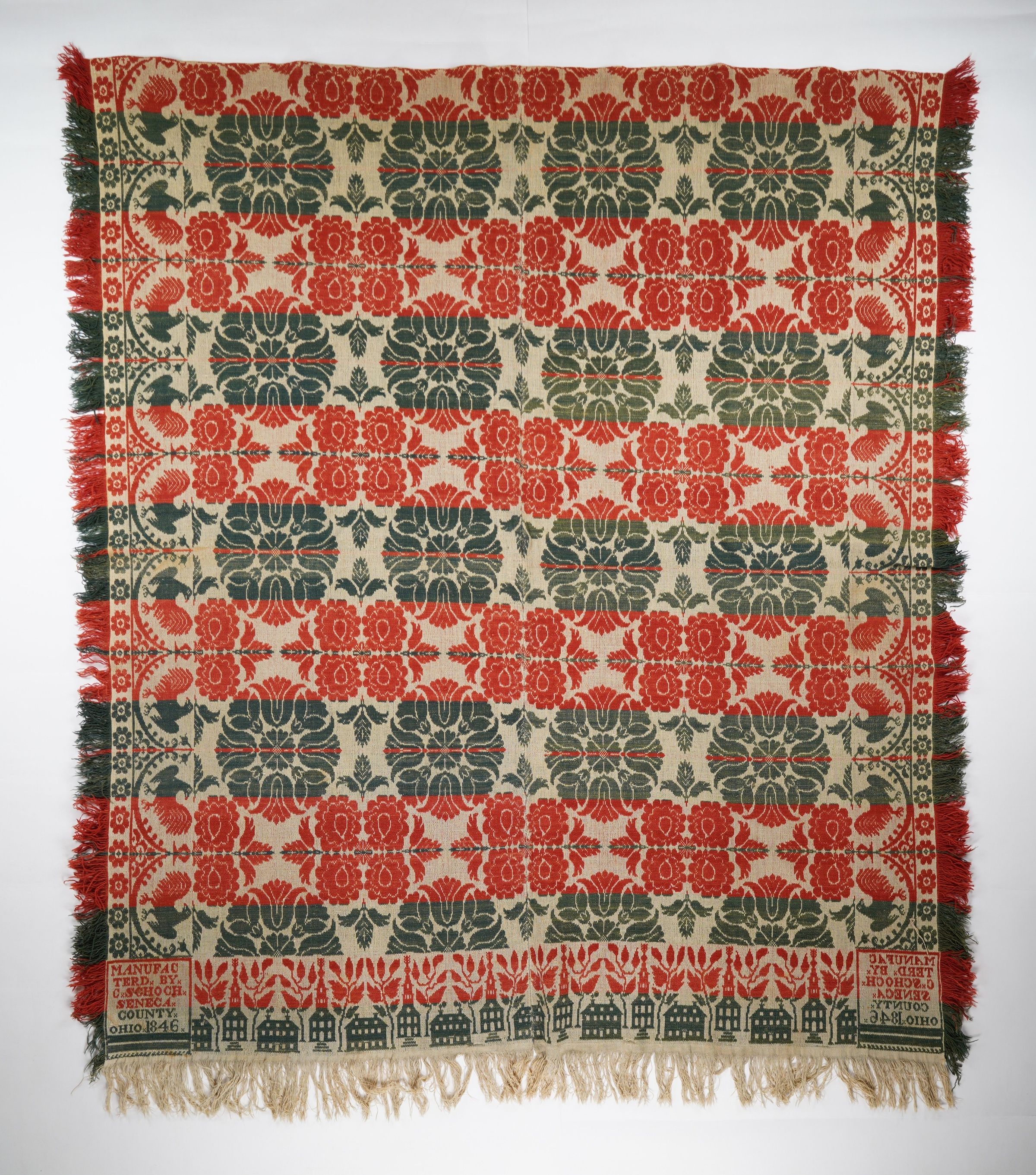 Red, green, and natural figured tied beiderwand coverlet with border and self-fringe on three sides. Two joined panels. Woven by Charles Schoch in Seneca Co., Ohio in 1846.Context