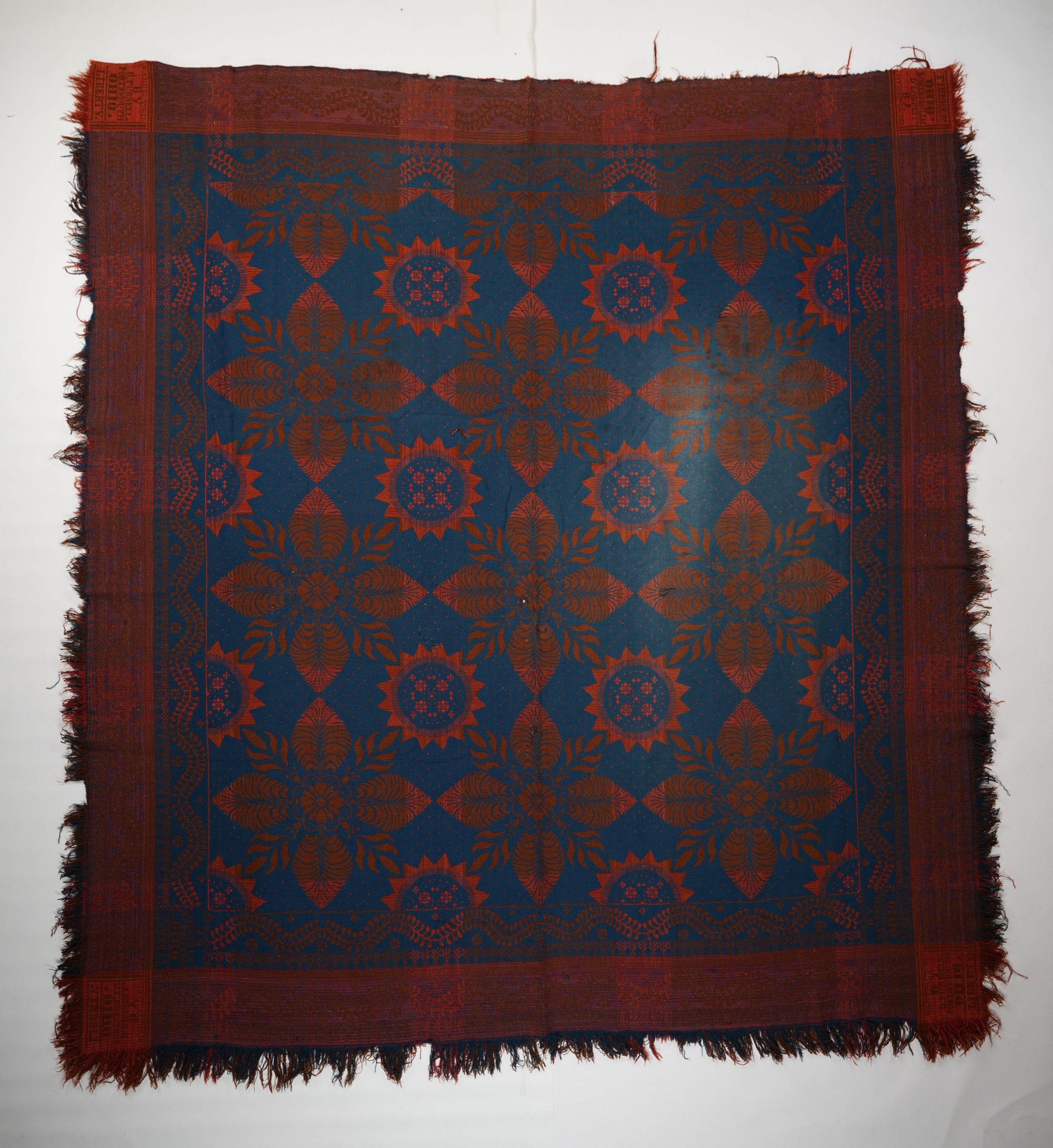 Navy and red figured doublecloth coverlet with border on four sides and self-fringe on three sides. Two joined panels. Woven by Daniel Pursell in Portsmouth, Scioto Co., Ohio.Collection