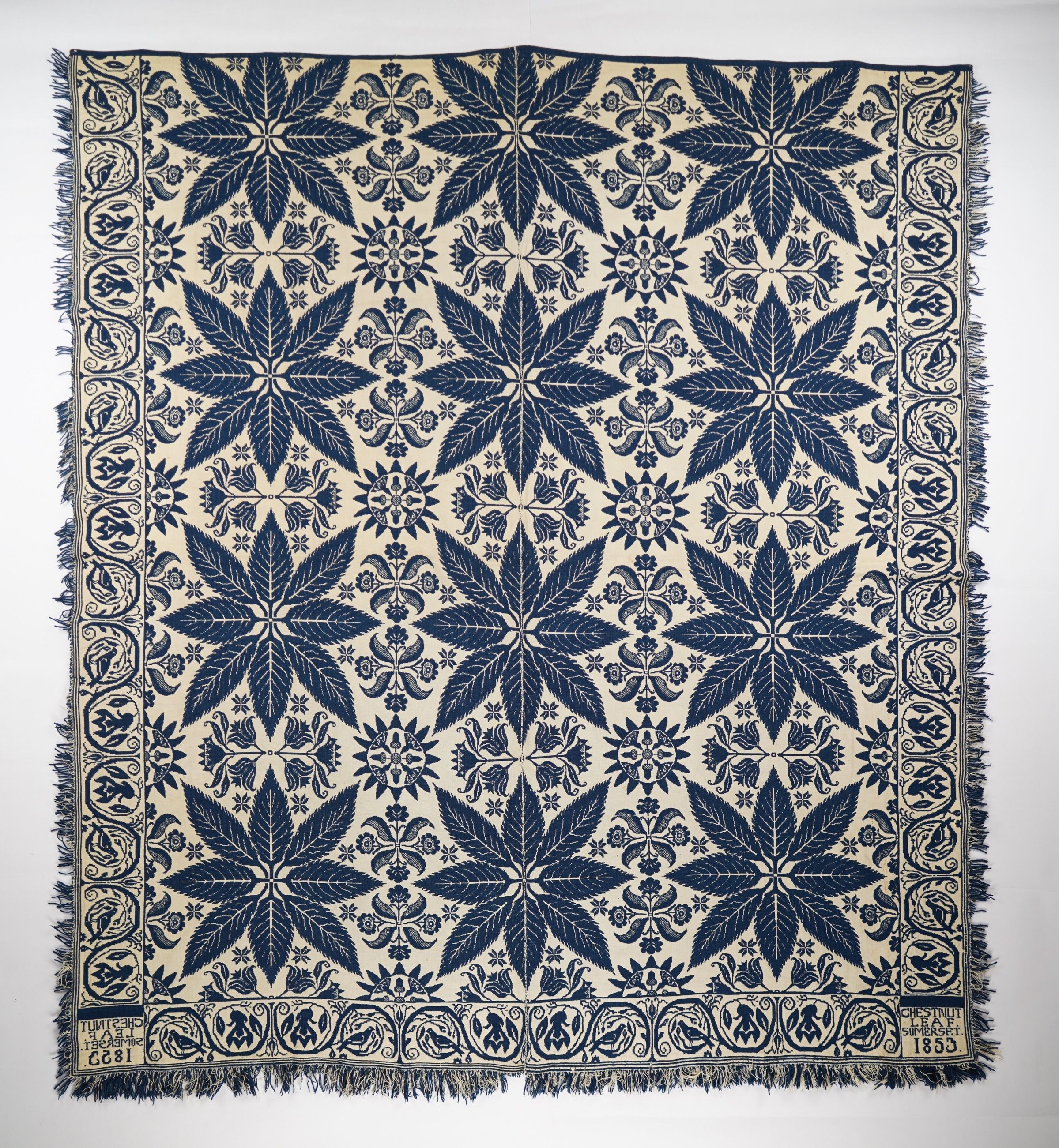 Navy and natural figured doubleweave coverlet with border and self-fringe on three sides. Two joined panels. Attributed to Frederick Hesse in Somerset, Perry Co., Ohio in 1853.Context