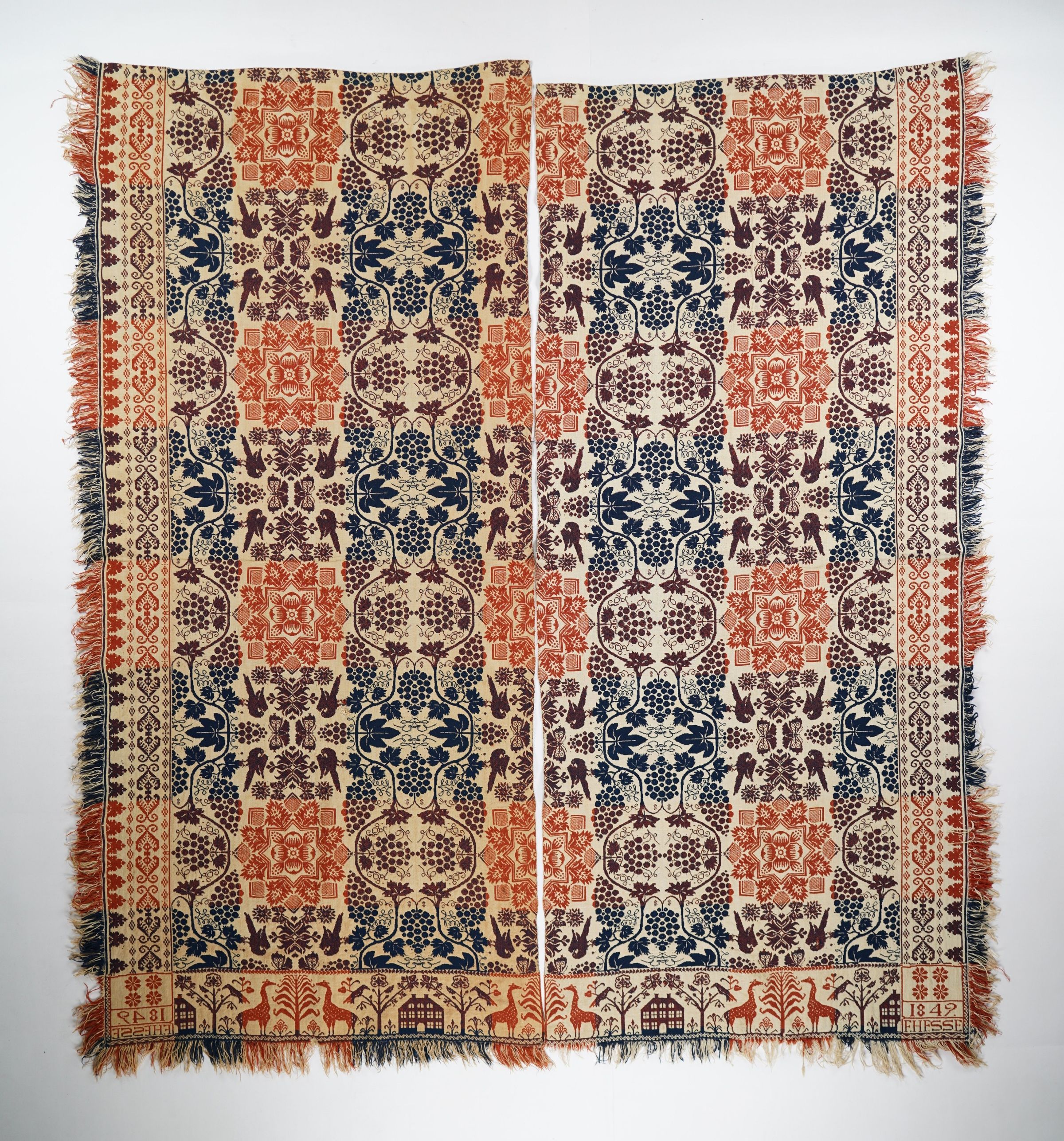 Figured and fancy doubleweave coverlet with borders on 3 sides and self-fringe on the sides and bottom. Two panels separate panels. Navy and red wool with undyed cotton. Grapevine and bird centerfield pattern; leaf border on sides; architecture and giraffe border on bottom. Woven by Frederick Hesse in 1849.Context
