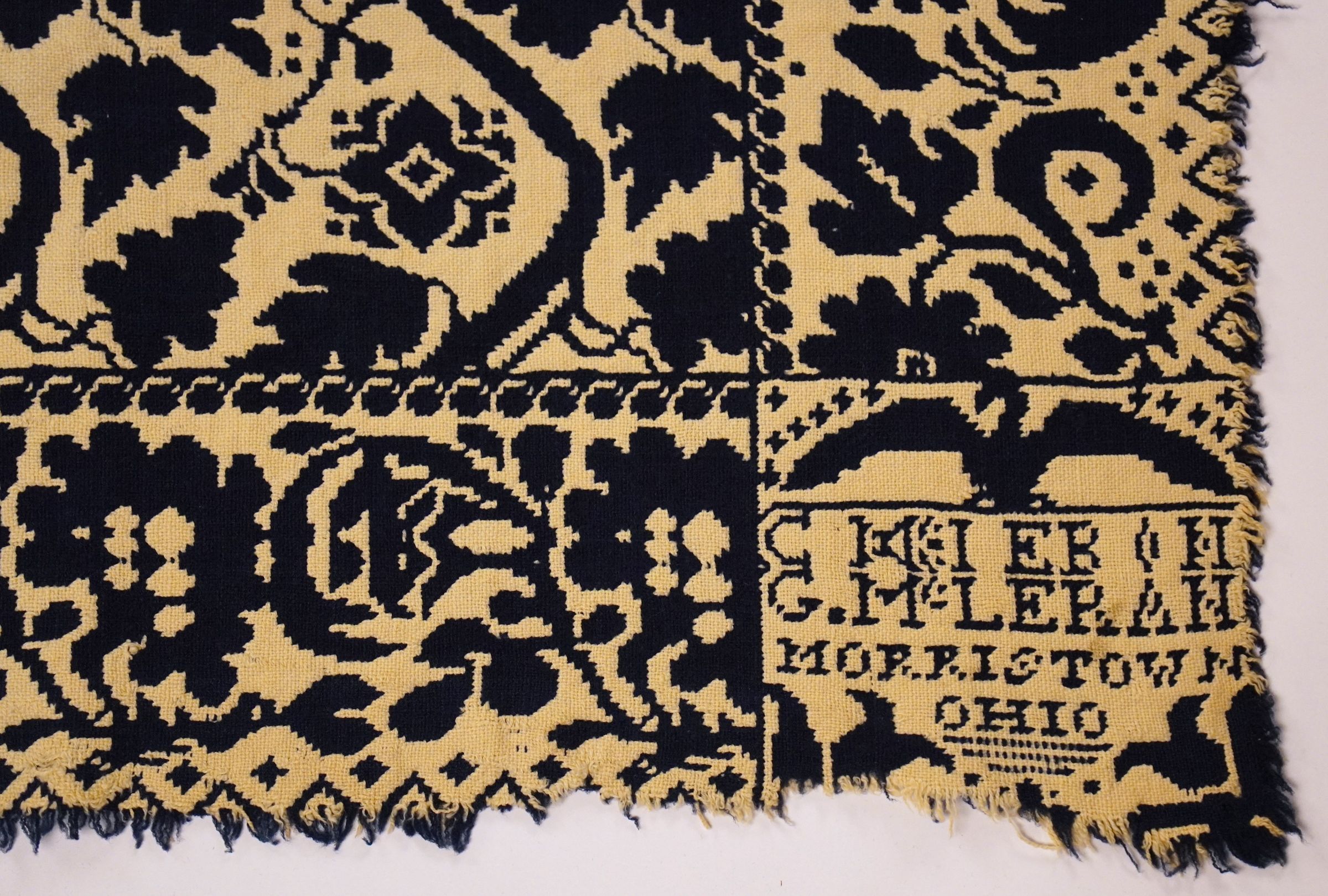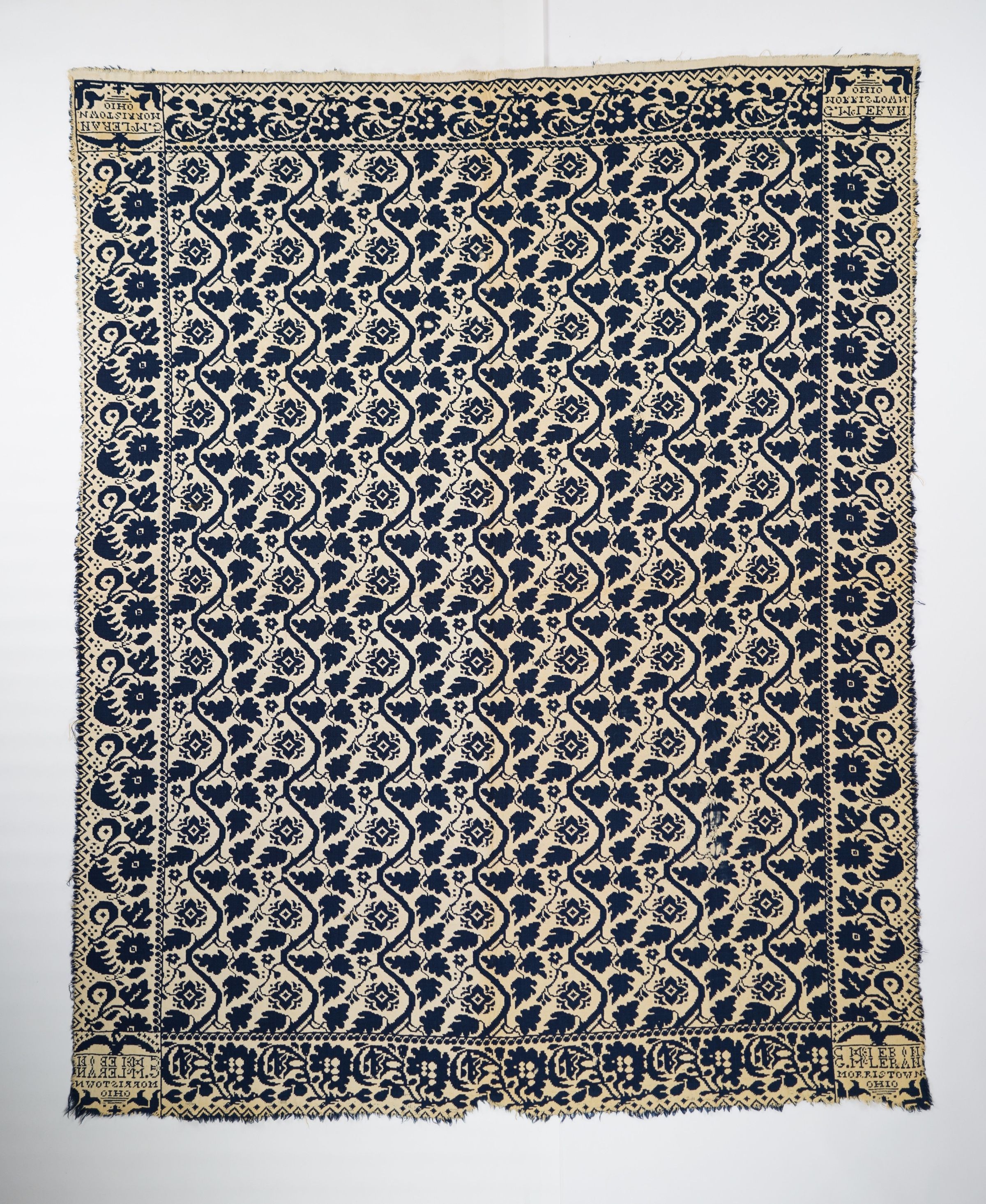 Navy and natural figured double weave coverlet with flower border on all sides. Woven in Morristown, Belmont Co., Ohio.Collection
