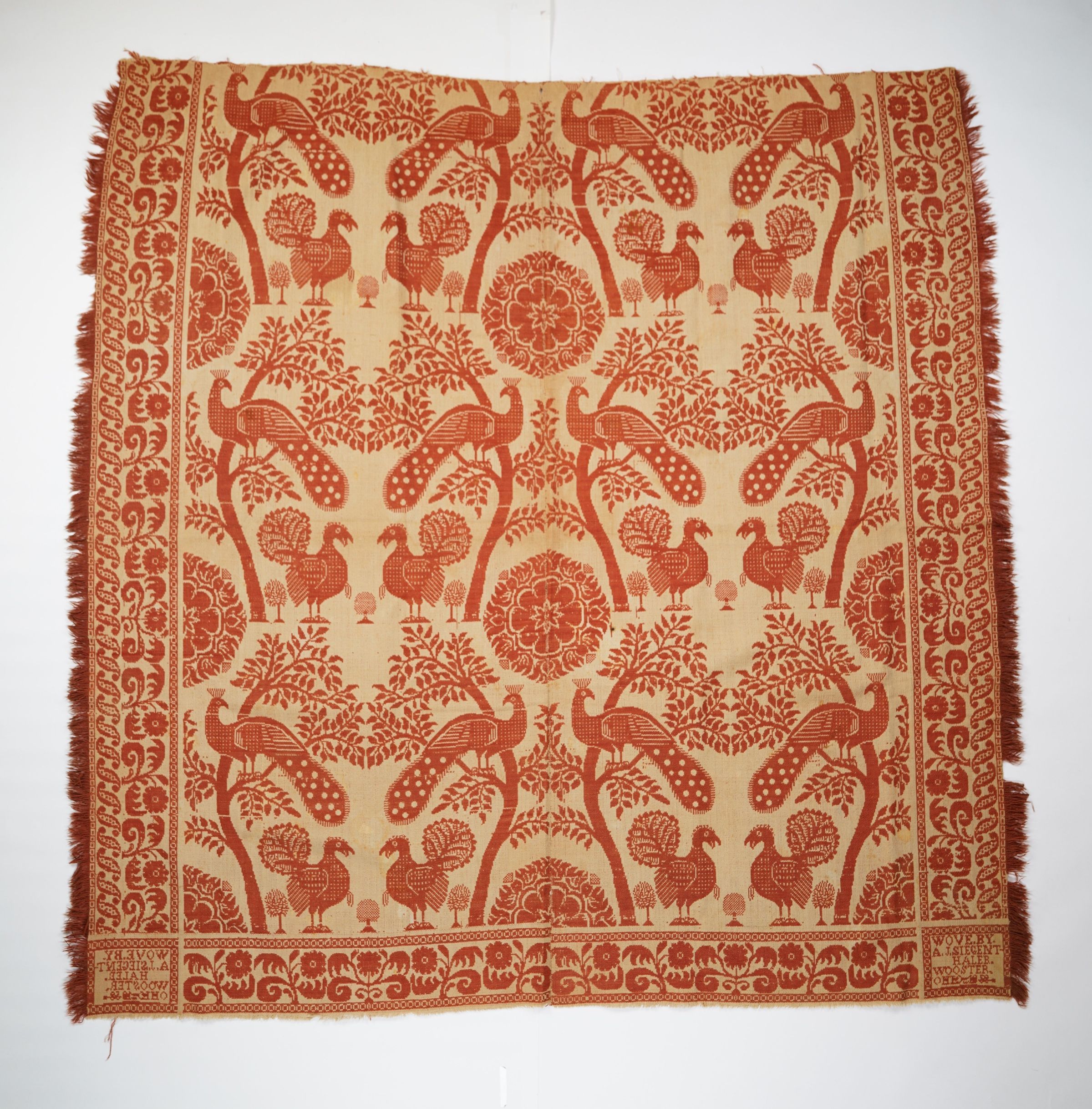 Burnt sienna and natural figured tied beiderwand coverlet with border on three sides and self-fringe on left and right sides. Two joined panels. Woven by J. A. Siegenthaler in Wooster, Wayne Co., Ohio in 1858.Collection