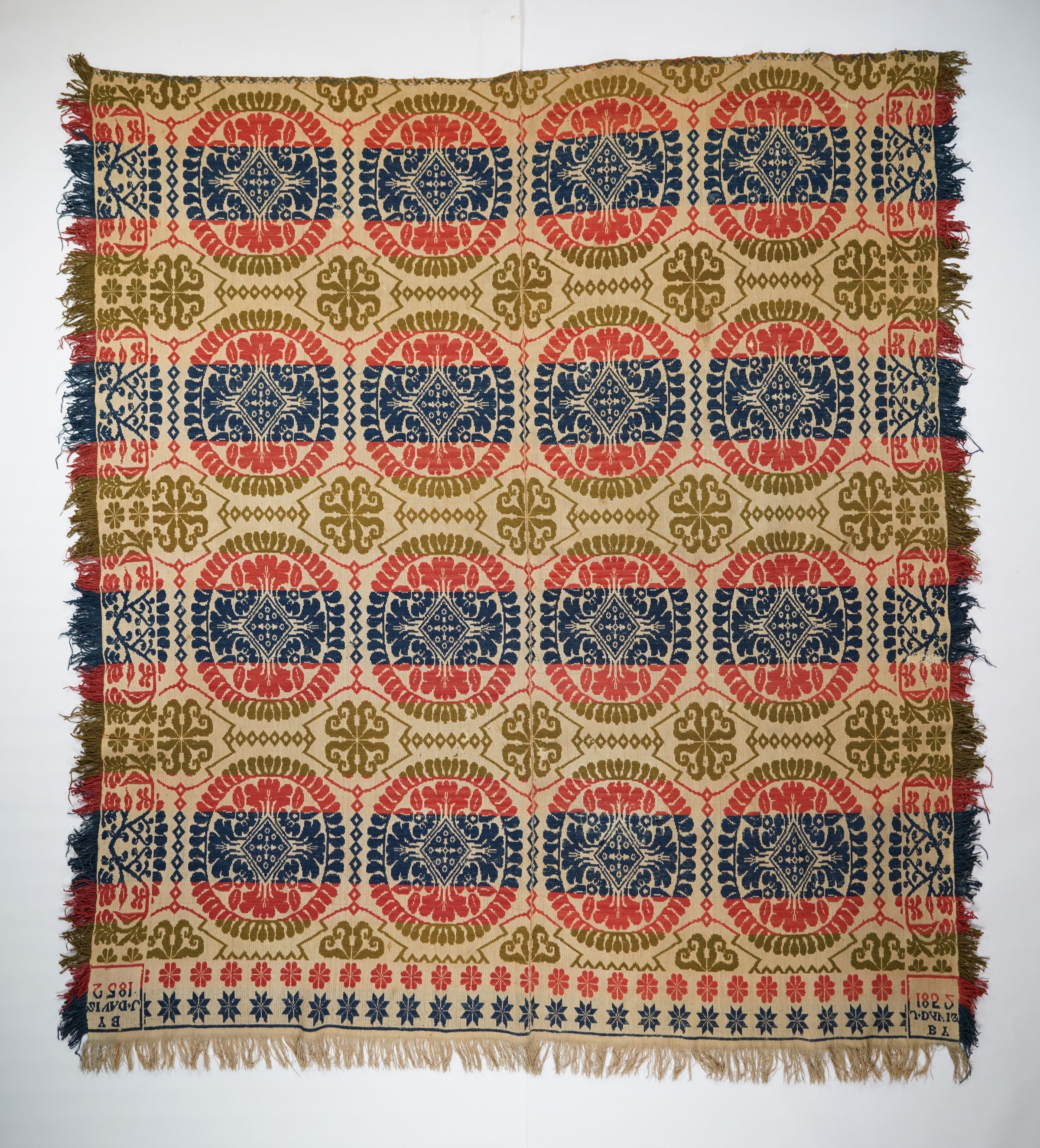 Red, green, navy, and natural figured tied beiderwand coverlet with border and self-fringe on three sides. Two joined panels. Woven by J. Davis in 1852.Collection