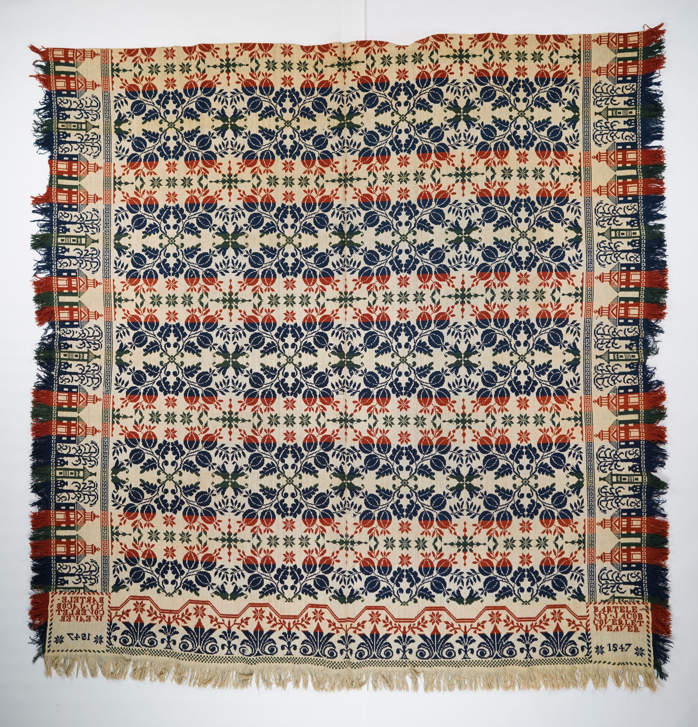 Red, green, navy, and natural figured tied beiderwand coverlet with self-fringe and border on three sides. Two joined panels. Woven by Jacob Bartelemey in New Britain, Stark Co., Ohio in 1847.Collection