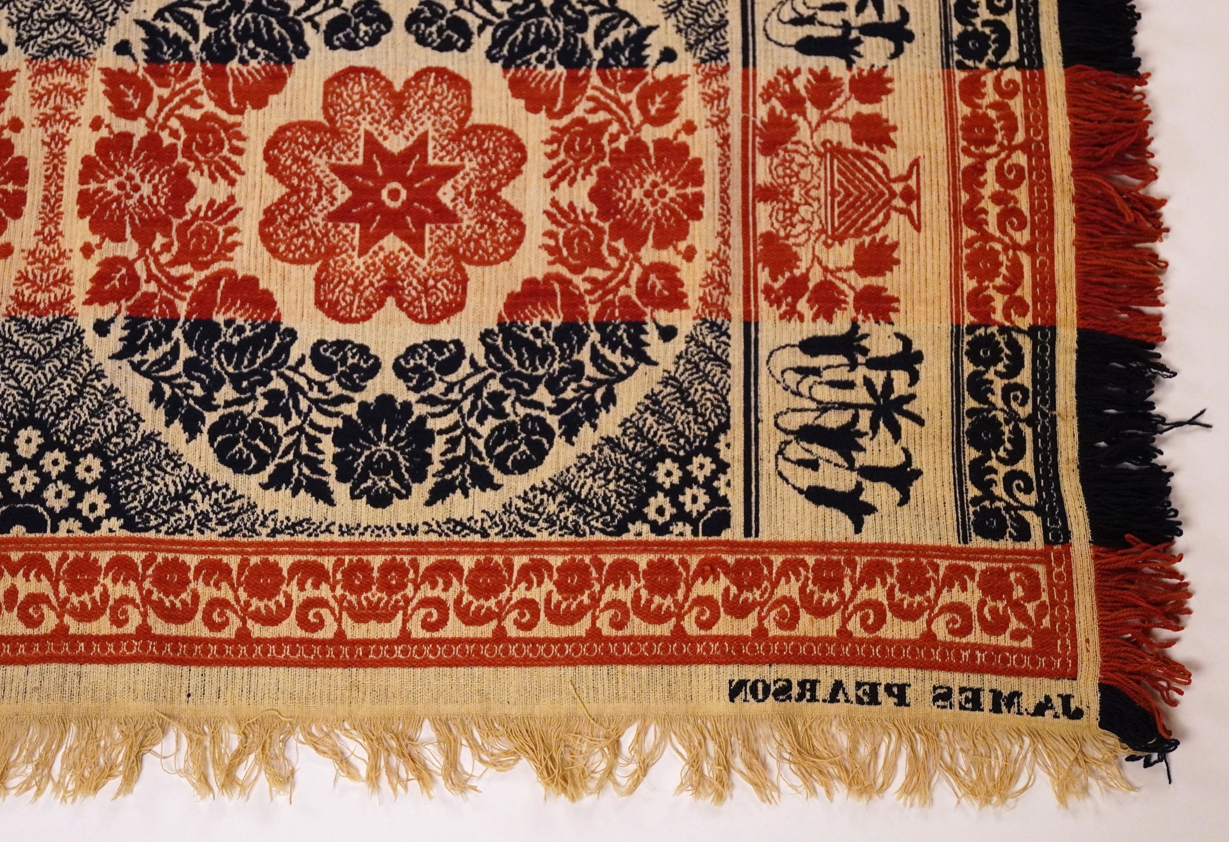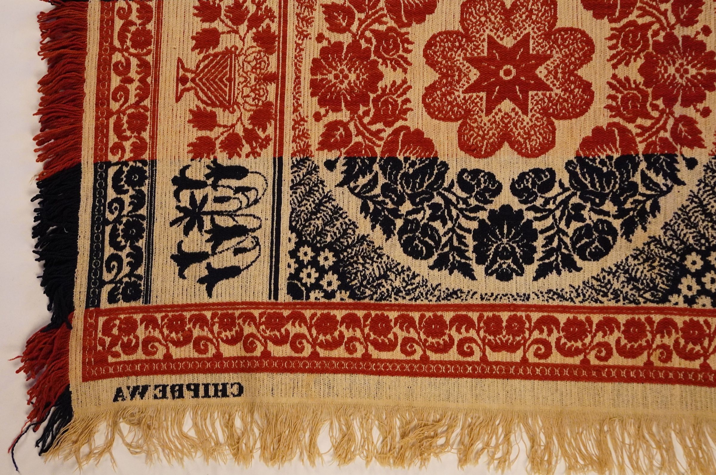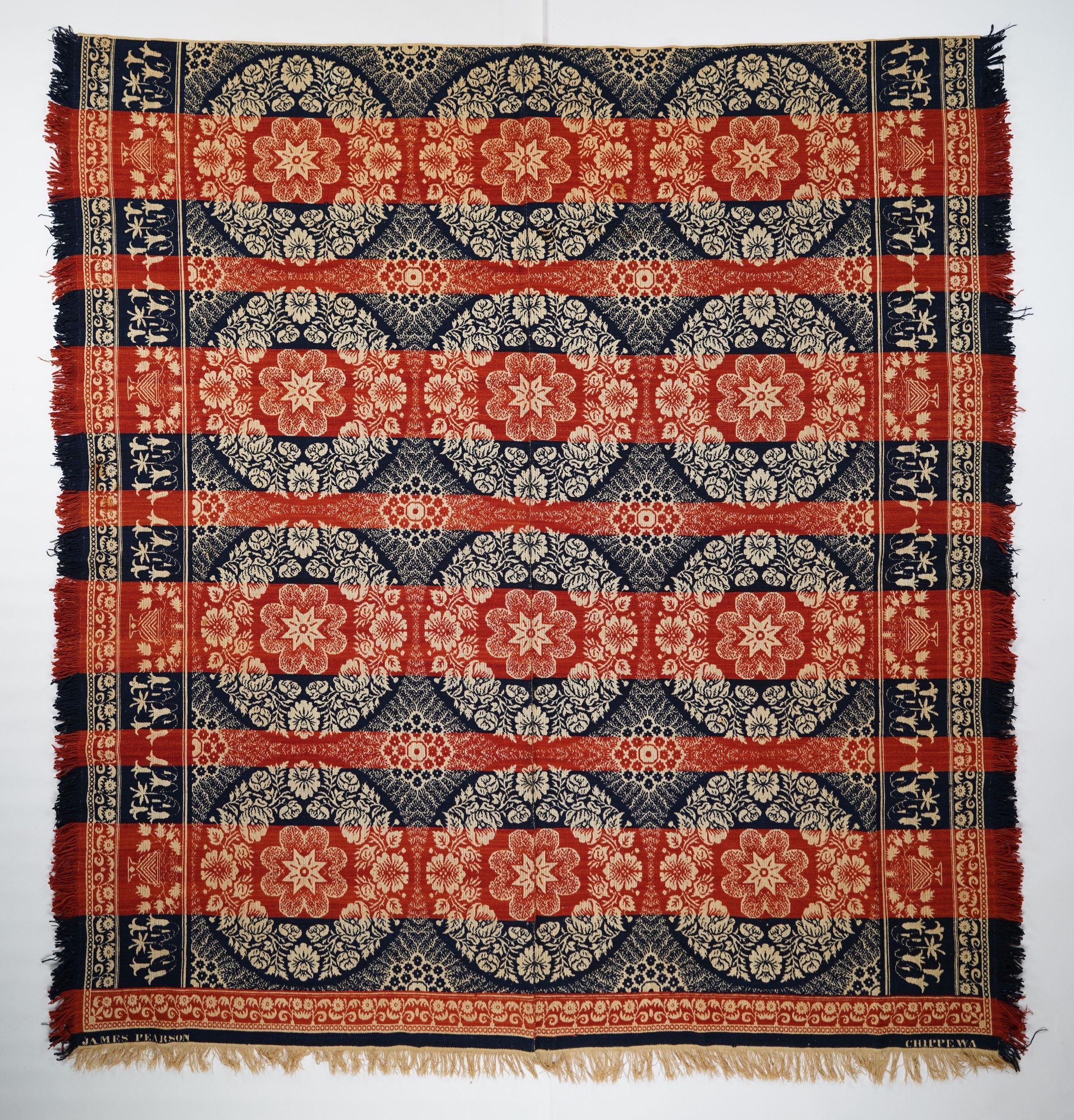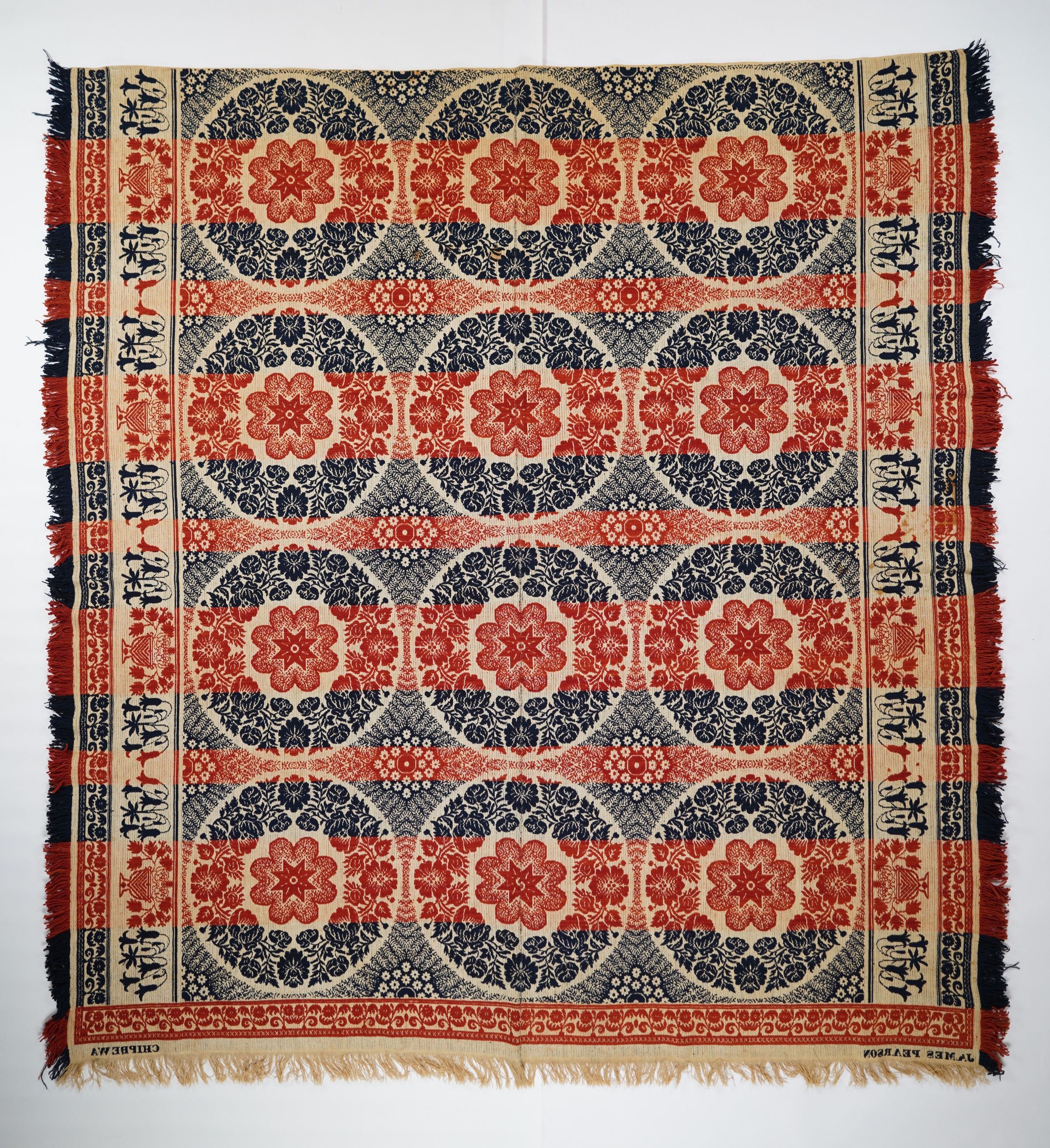 Navy, red, and natural figured tied beiderwand coverlet with self-fringe and flower border on three sides. Woven by James Pearson in Chippewa, Medina Co., Ohio.Collection