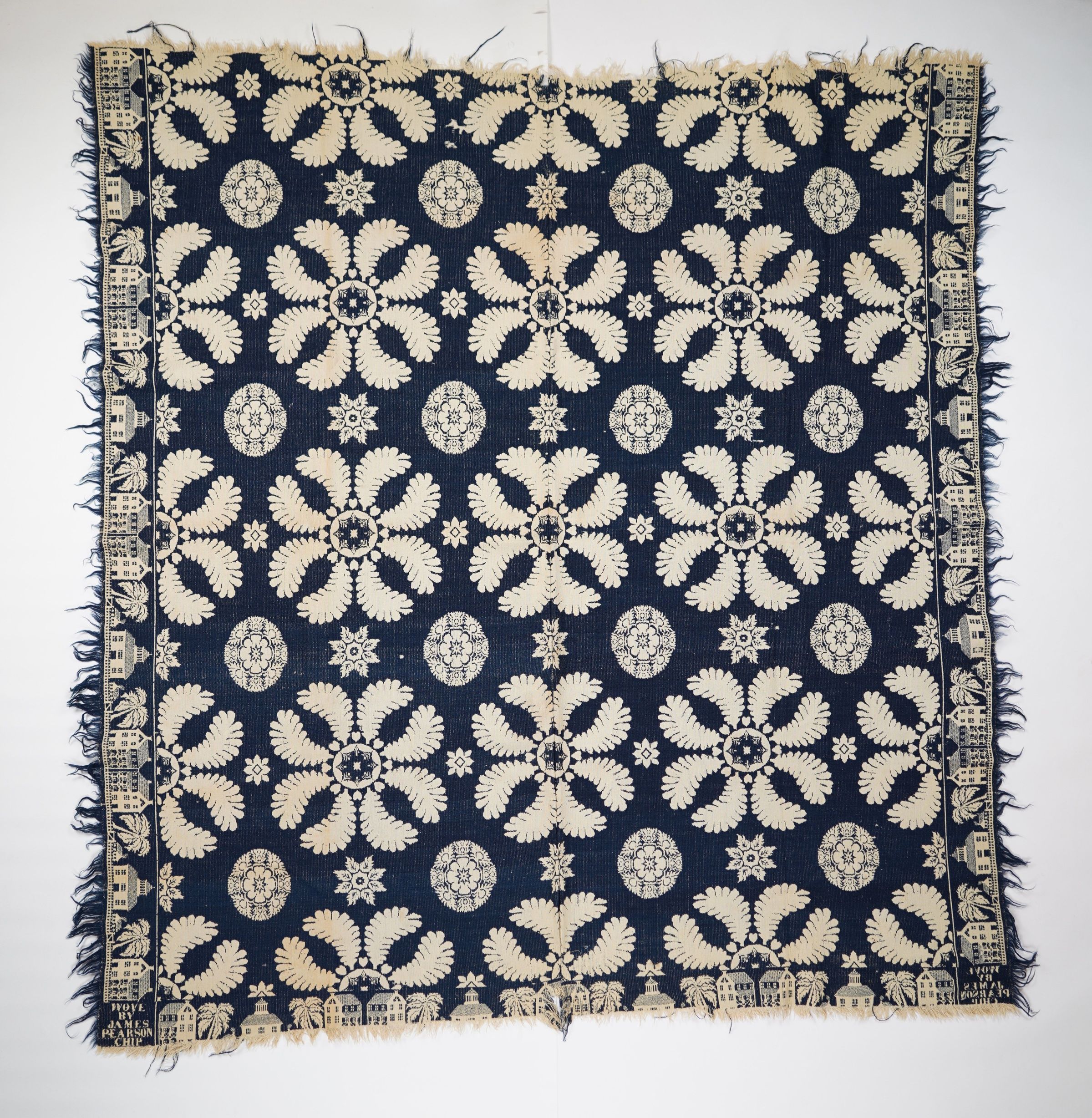 Navy and natural figured tied beiderwand coverlet with border and self-fringe on three sides. Two joined panels. Woven by James Pearson in Chippewa, Medina Co., Ohio.Collection