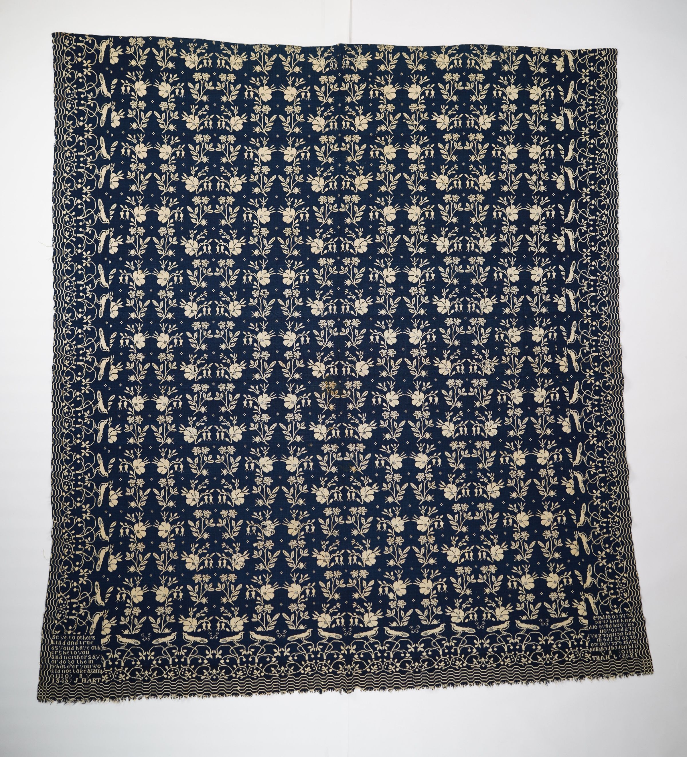 Navy and natural figured double weave coverlet with border on three sides. Seamless. Cornerblocks feature the Golden Rule. Woven by Jesse Hart in Ohio in 1845.Collection