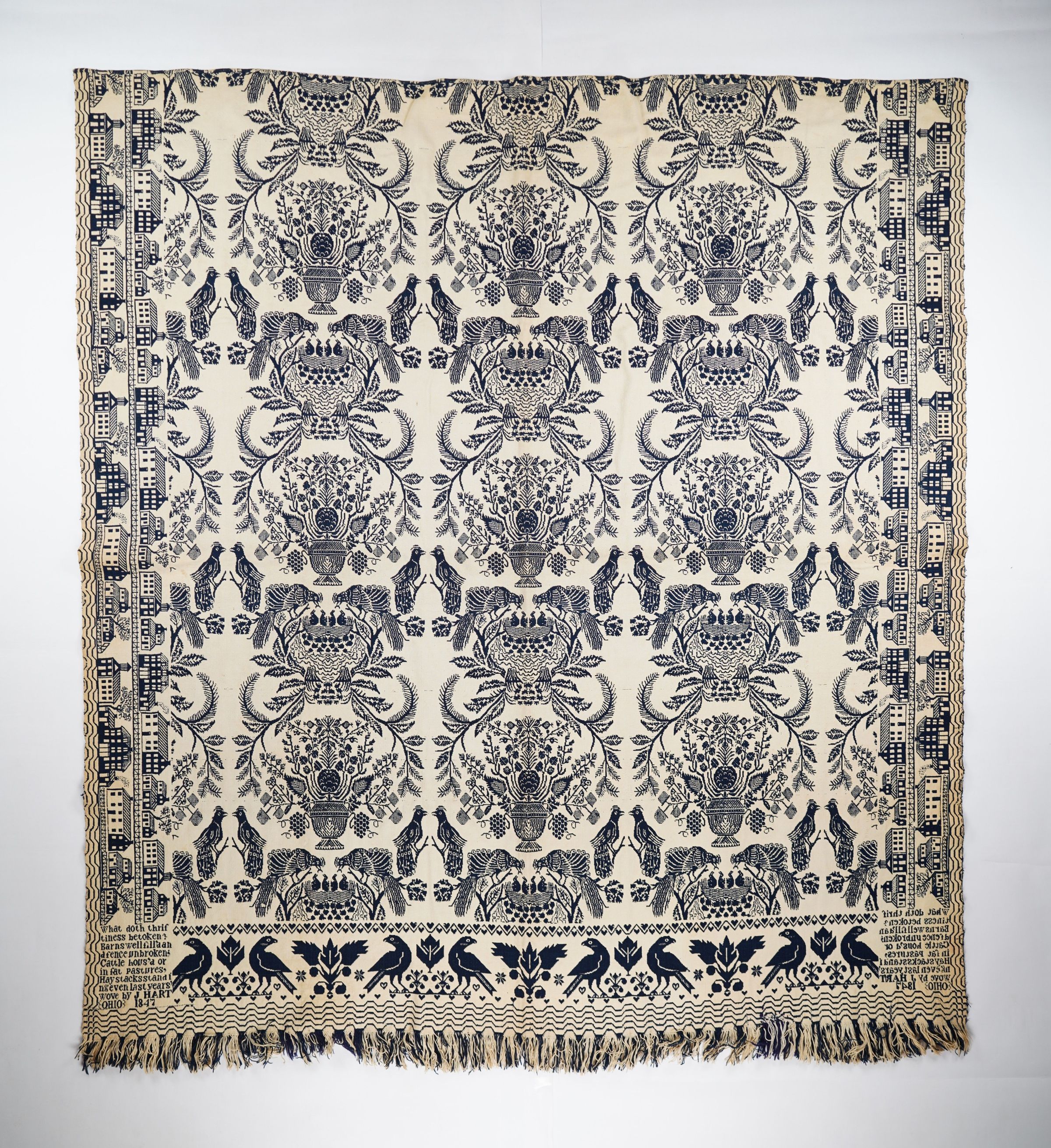 Figured doubleweave coverlet with borders on 3 sides and applied fringe on bottom. Woven full-width; seamless. Navy wool with undyed cotton. Bird and urn centerfield; distelfink bottom border; architectural side borders. Woven by Jesse Hart in 1847 with "What doth thriftiness betoken?" cornerblock.Context