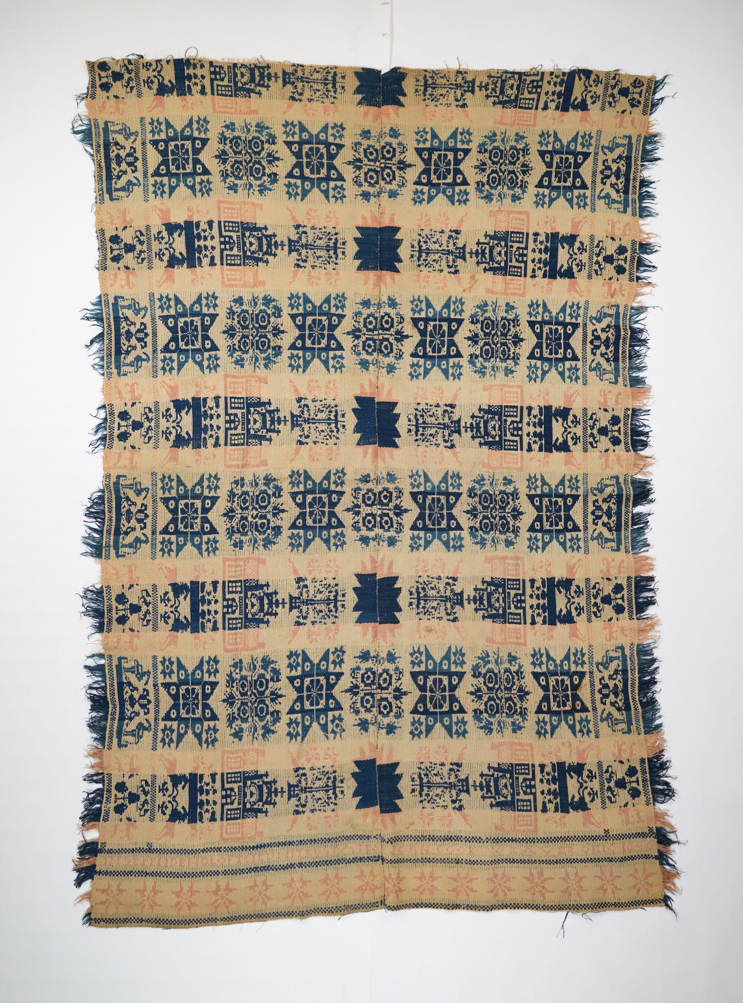 Pink, blue, navy, and natural figured tied beiderwand coverlet with border and self-fringe on three sides. Two joined panels. Woven by John Cook in Ohio in 1848.Collection
