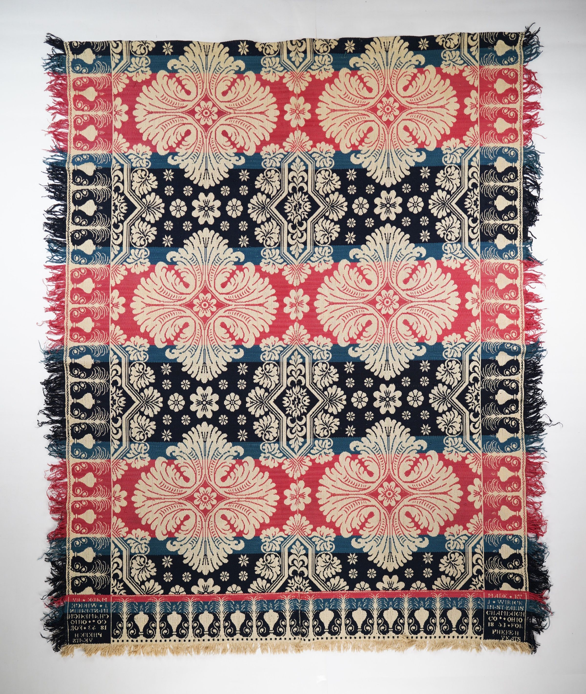 Figured tied beiderwand coverlet with borders on three sides and self-fringe on both sides and bottom. Two panels joined by a center seam. Navy, lighter blue, and pink wool with undyed cotton. Leafy medallion centerfield pattern; abstract urn border on sides and bottom. Woven by John Wirick for Phoebe Yeats in 1853.Context